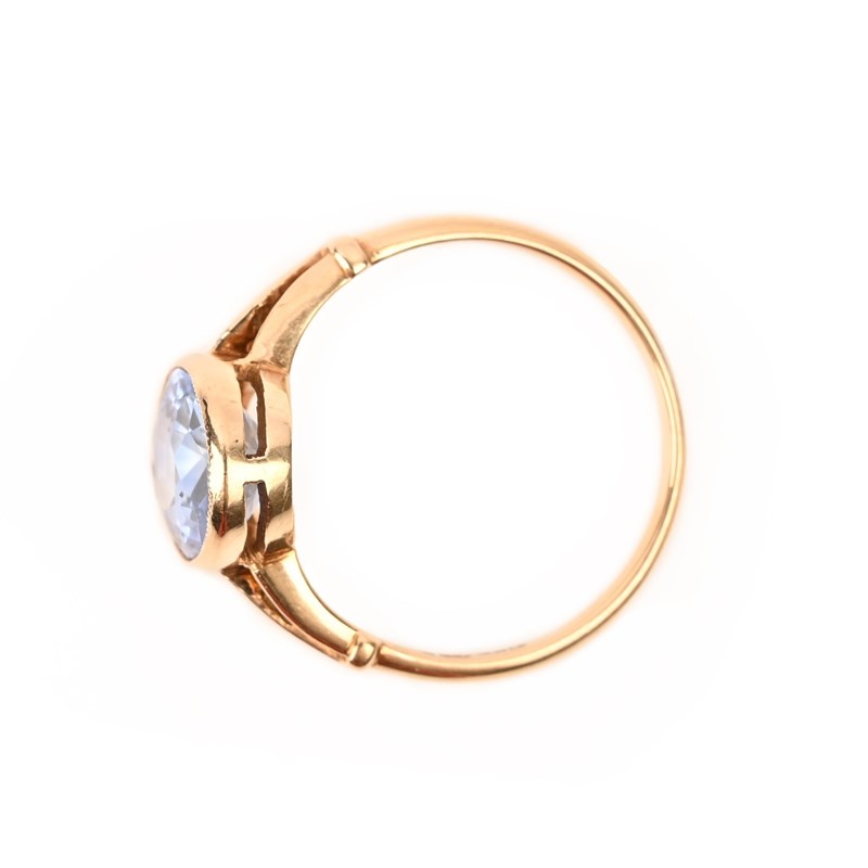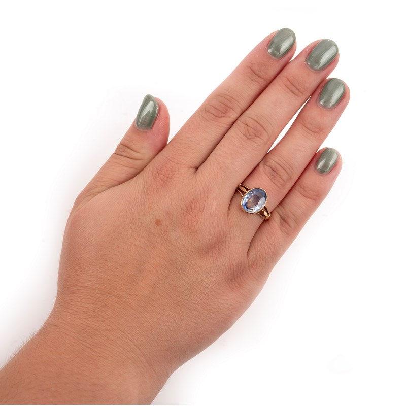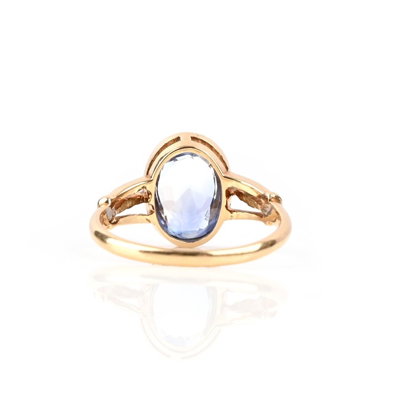 A SAPPHIRE SOLITAIRE RING, set with an oval-shaped sapphire in a milligrain setting to trifurcated yellow gold shoulders, stamped 18ct, size P