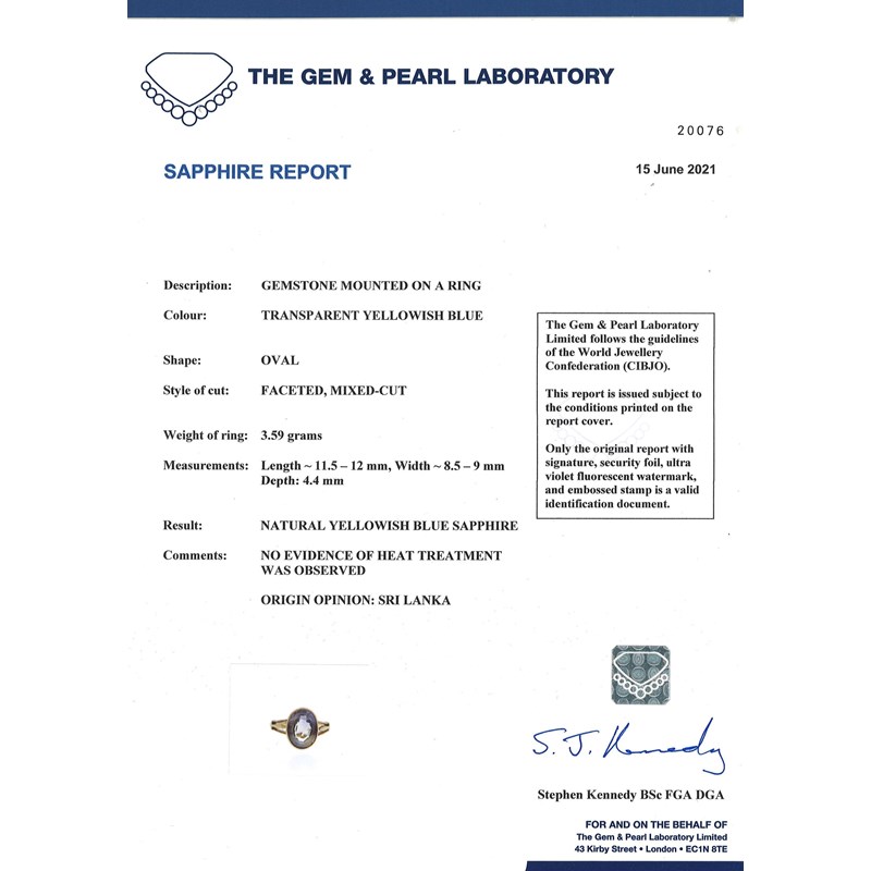Accompanied by Gem & Pearl Laboratory report number 20076 dated 15th June 2021 stating that the natural yellowish blue sapphire shows no evidence of heat treatment, origin: Sri Lanka (Ceylon)