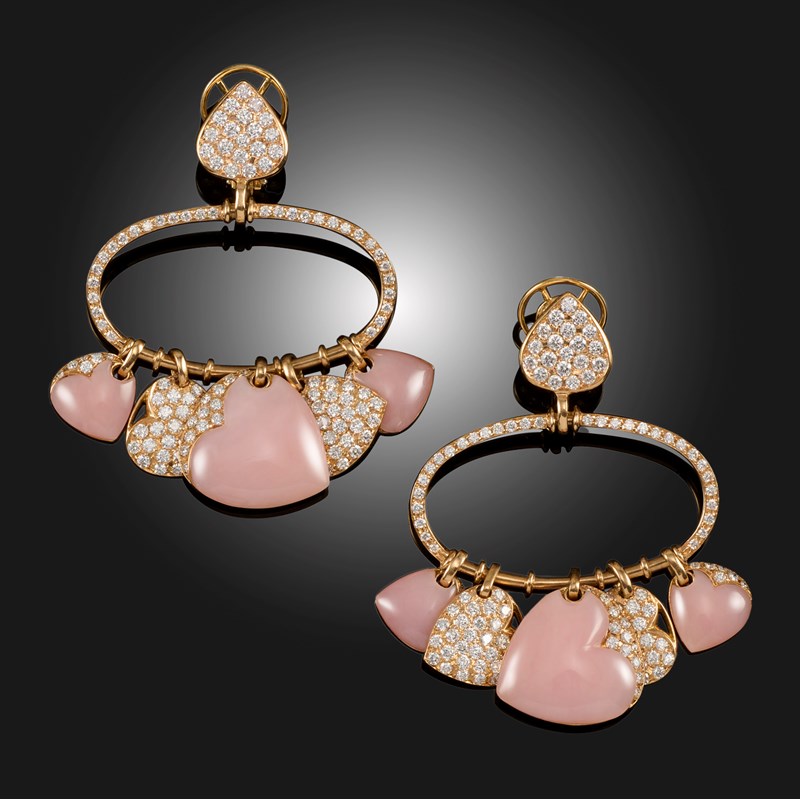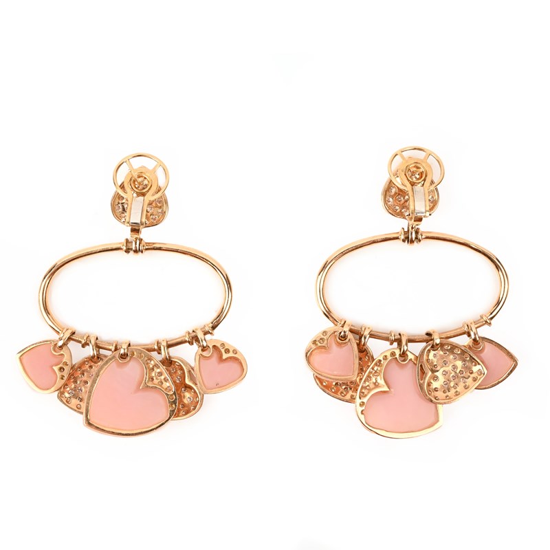 A PAIR OF PINK OPAL AND DIAMOND EARRINGS, each with five heart-shaped pendants set with pink opals and round brilliant-cut diamonds alternately, suspended from a diamond-set hoop below a surmount pavé-set with round brilliant-cut diamonds in gold, stamped 750, clip and post fittings, length 6.5cm