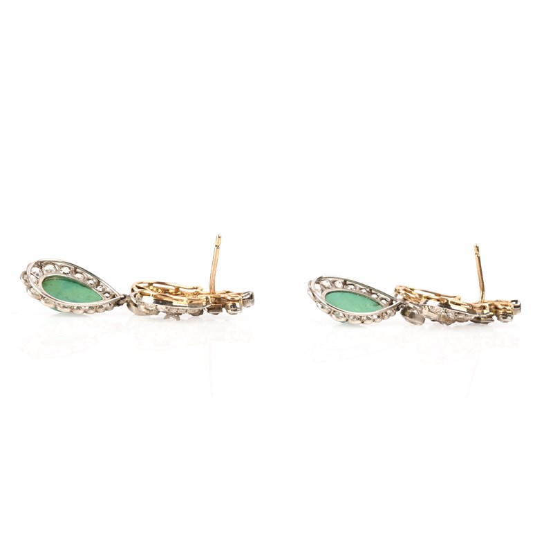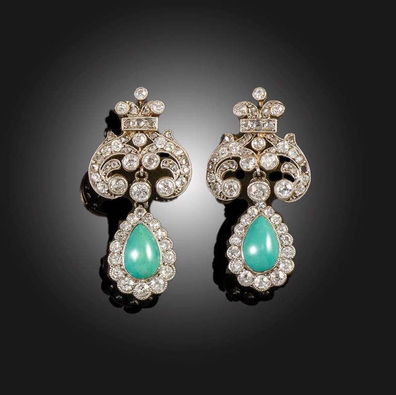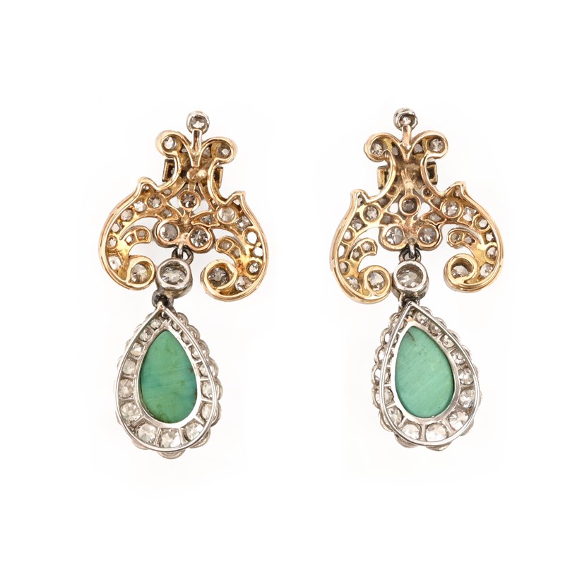 A PAIR OF TURQUOISE AND DIAMOND EARRINGS, CONVERTED, each with a scrolling surmount set with old circular-cut and rose-cut diamonds, suspending a pear-shaped turquoise cabochon within a border of millegrain-set old circular-cut diamonds in platinum and gold, post fittings, butterflied deficient, length 3.6cm