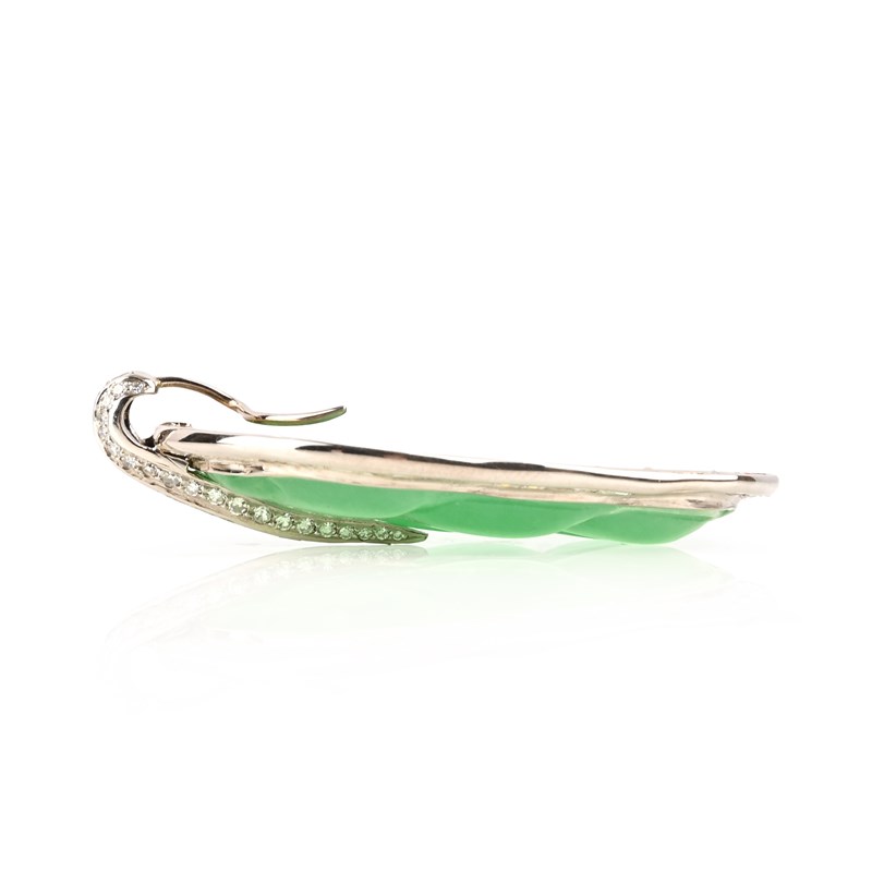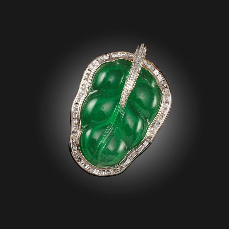 A JADE AND DIAMOND PENDANT, design as a leaf, the carved green jade within a border of diamonds, mounted in white gold, length 5.3cm