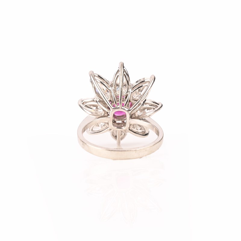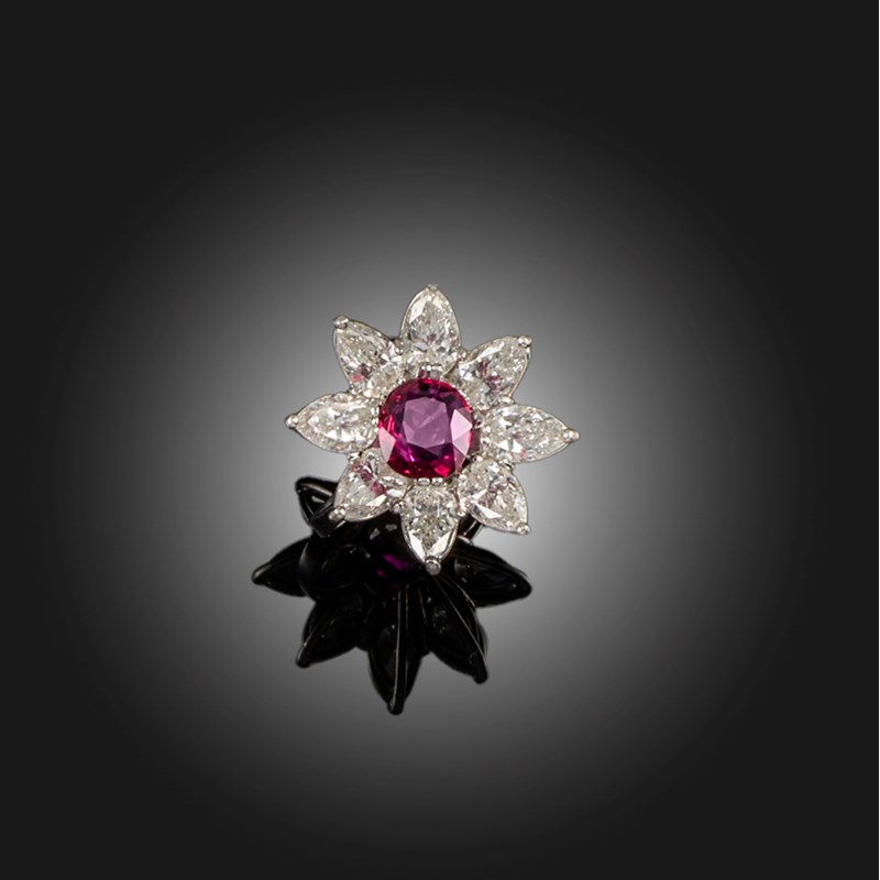 A RUBY AND DIAMOND CLUSTER RING, of flowerhead design, set to the centre with a cushion-cut ruby weighing 1.57cts, within a surround of pear-shaped diamonds, in platinum, stamped PT950 and with a maker's mark, size M
