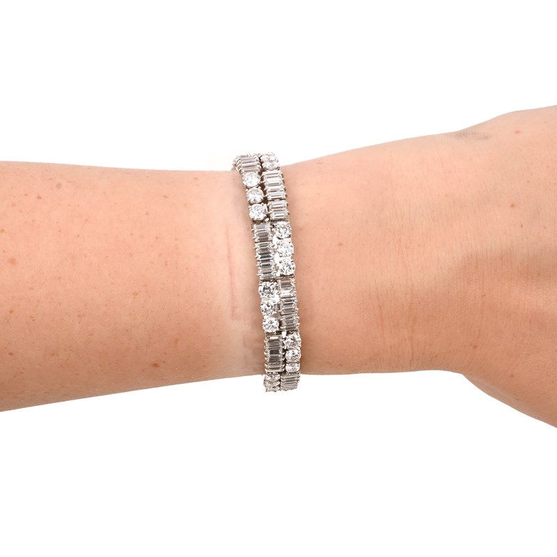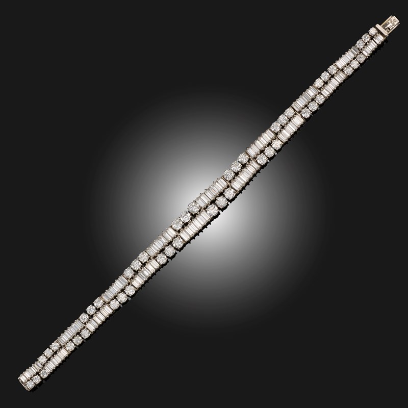 A DIAMOND BRACELET, composed of tapering links set with alternating rows of round brilliant-cut and baguette-shaped diamonds, mounted in platinum and gold, French control marks and rubbed maker's lozenge, length 18.3cm