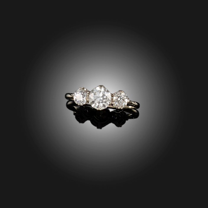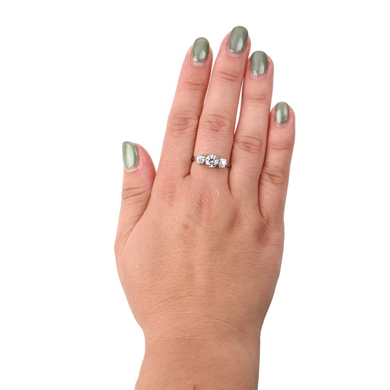 A DIAMOND THREE STONE RING, the three old circular-cut diamonds weighing approximately 0.90, 0.35 and 0.30cts, in white gold, stamped 18ct, size R