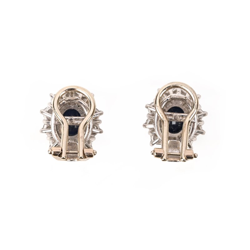 A PAIR OF SAPPHIRE AND DIAMOND EARRINGS, each set with an oval sapphire within a surround of round brilliant-cut diamonds in white gold, length 15mm, post and clip fittings