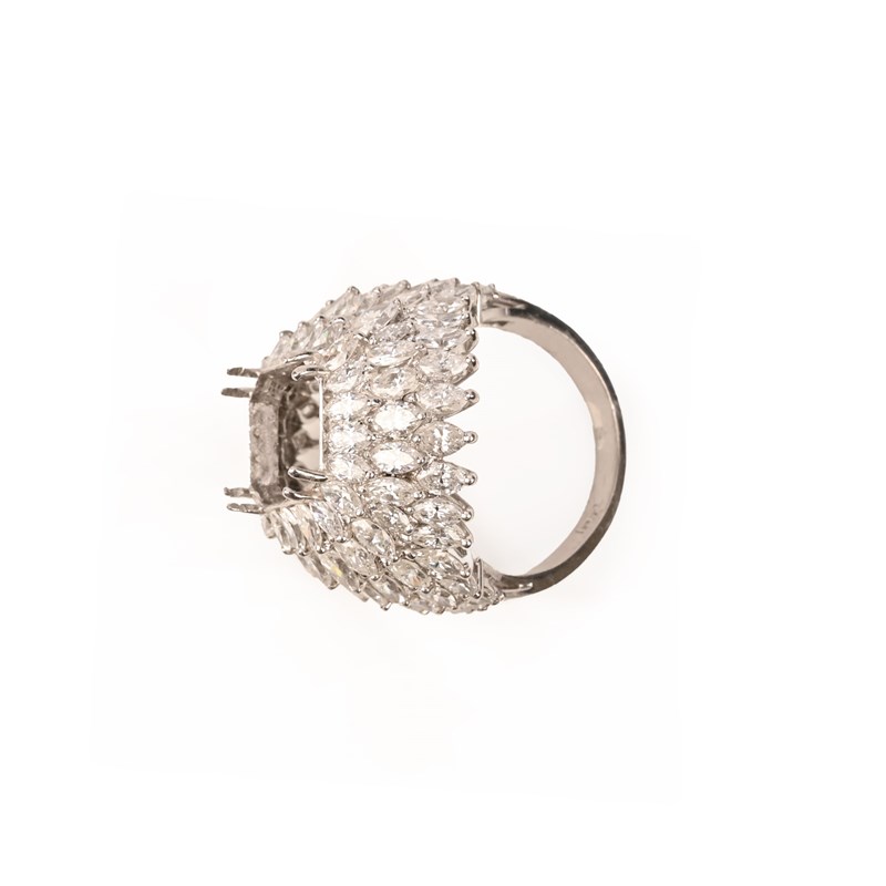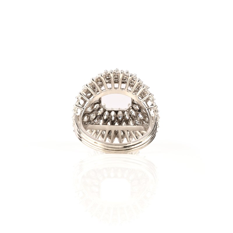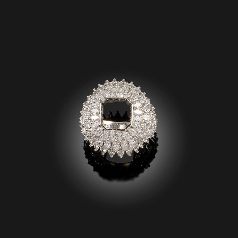 A DIAMOND-SET PLATINUM RING MOUNT, of bombé design, the raised setting set with marquise-shaped diamonds, stamped Pt, size N 1/2, gross weight 14g