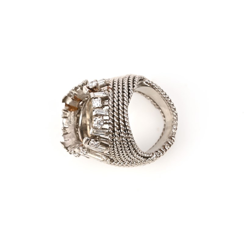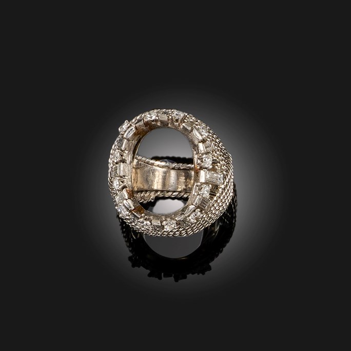 A DIAMOND-SET PLATINUM RING SHANK, set with a pierced border of baguette-shaped and circular-cut diamonds above a high surround of ropetwist design, French control mark, staped Pt950, size F 1/2, gross weight 17g