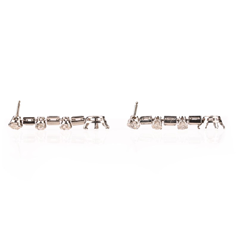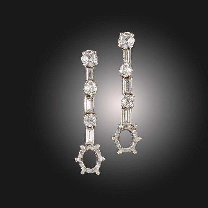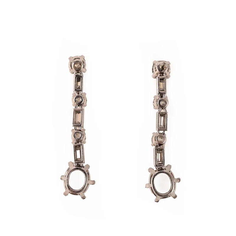 A PAIR OF DIAMOND EARRING MOUNTS, each designed as a drop composed of alternating old circular-cut and baguette-shaped diamonds suspending a vacant setting, in platinum, post fittings, length 4cm