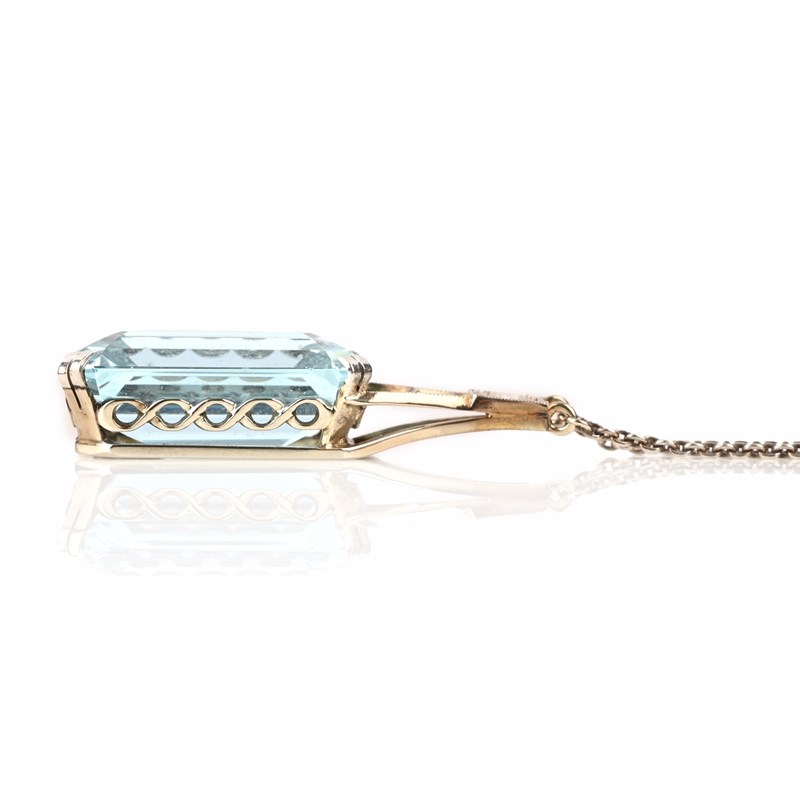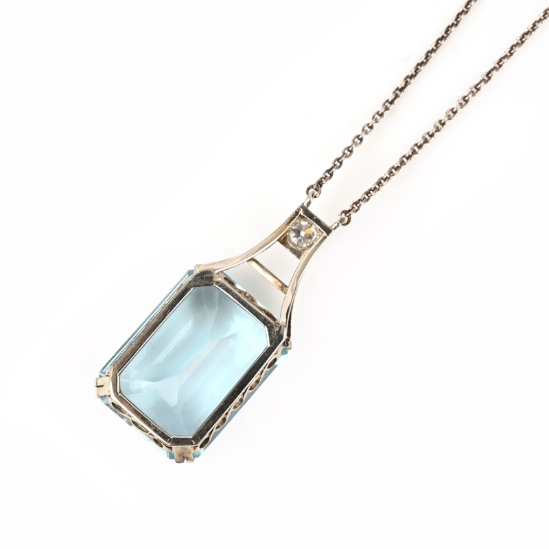 AN AQUAMARINE AND DIAMOND PENDANT NECKLACE, set with an emerald-cut aquamarine weighing approximately 15.00cts in tapering pierced white gold mount below an old circular-cut diamond in a square milligrain setting, to a fine link white gold back chain, clasp stamped 585, pendant length 3.3cm, chain length 43cm