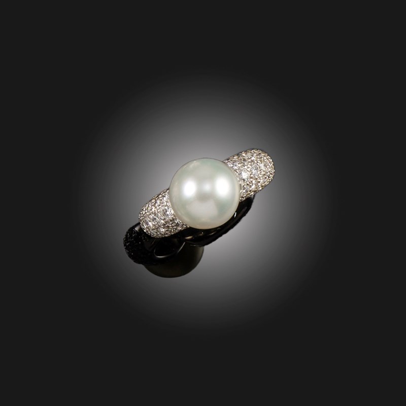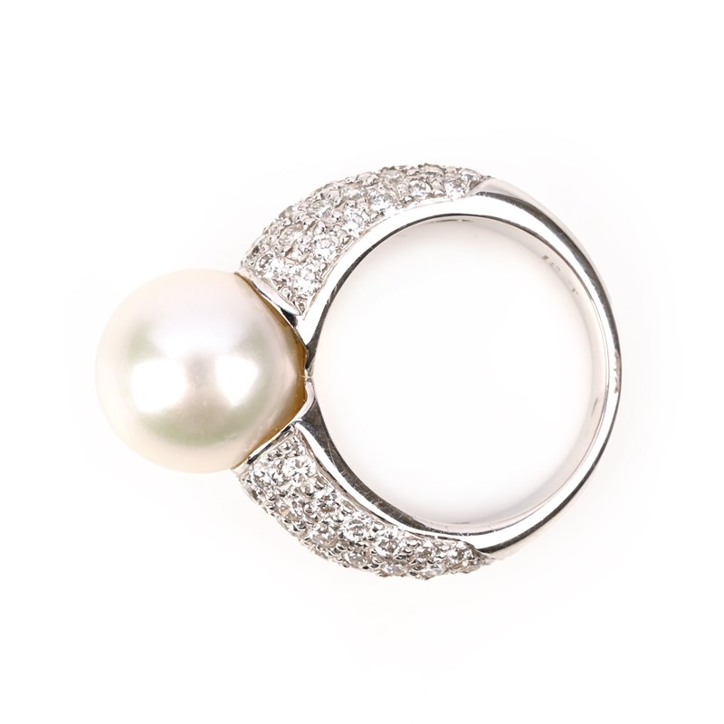 A CULTURED PEARL AND DIAMOND RING, set with a cultured pearl measuring approximately 11.6-11.8mm, to shoulders pavé-set with graduated round brilliant-cut diamonds, in white gold, stamped 18ct, size N 1/2