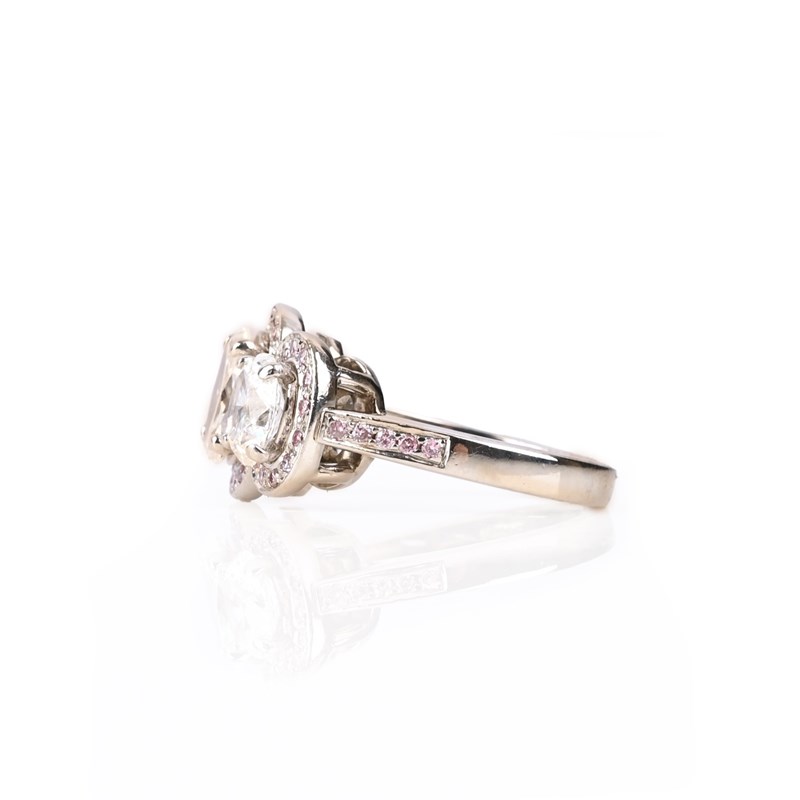A DIAMOND THREE STONE RING, CIRCA 2007, set with three graduated oval-shaped diamonds weighing approximately 0.60, 1.00 and 0.55cts, within a surround of pink diamonds in platinum, London hallmarks for 2007, size M
