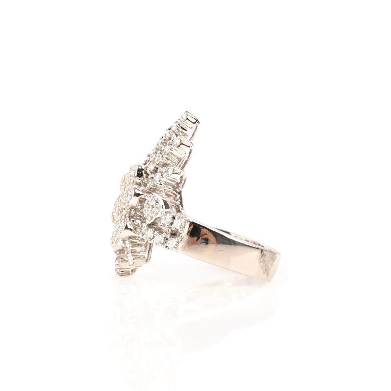 A DIAMOND AND 18CT GOLD DRESS RING, 2003, centring on a floral crossover motif set with round brilliant-cut diamonds, mounted in 18ct white gold, London hallmarks for 2003, size P 1/2, gross weight 12g