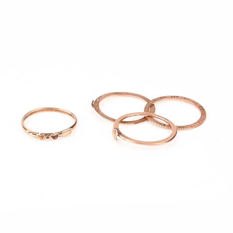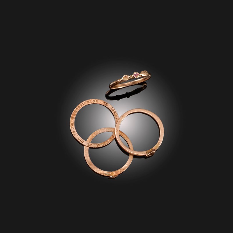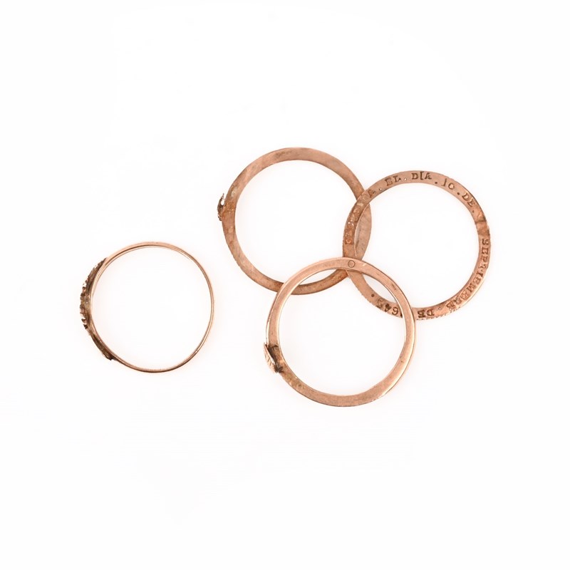 A 17TH CENTURY GOLD GIMMEL RING, CIRCA 1645, the three plain gold bands opening to reveal the inscription RECUERDA.EL.DIA.10.DE.SEPTIEMBRE.DE.1645.,translating to mean remember the day of 10th September 1645, size O 1/2; with a plain gold band decorated with two stylised hearts, size M