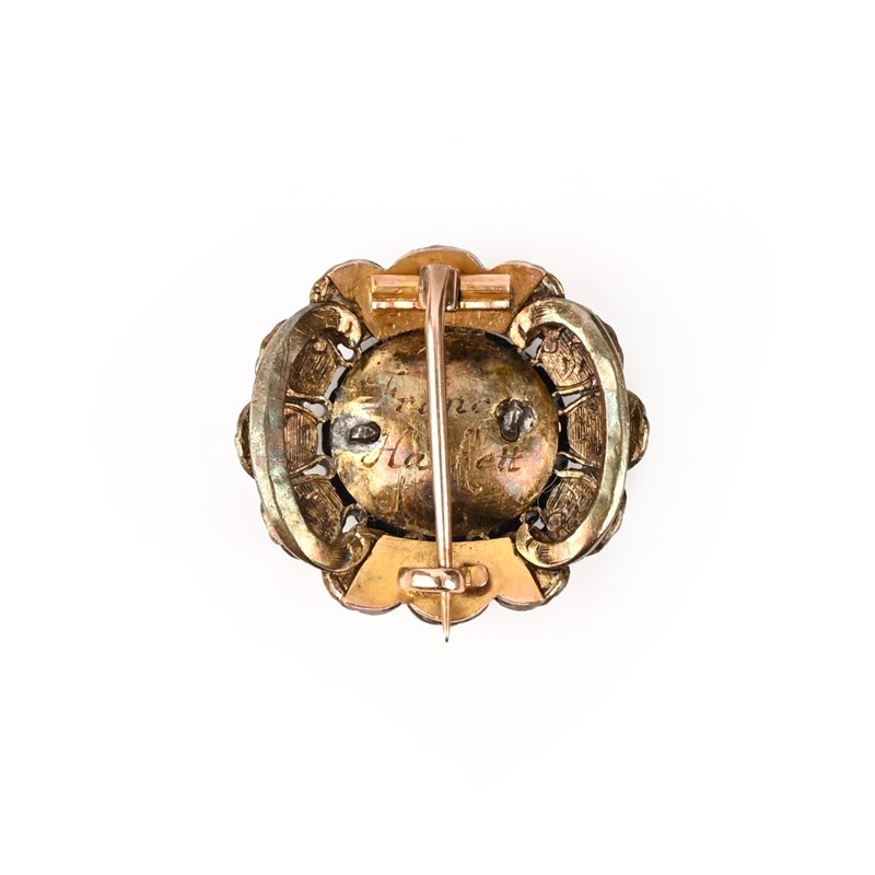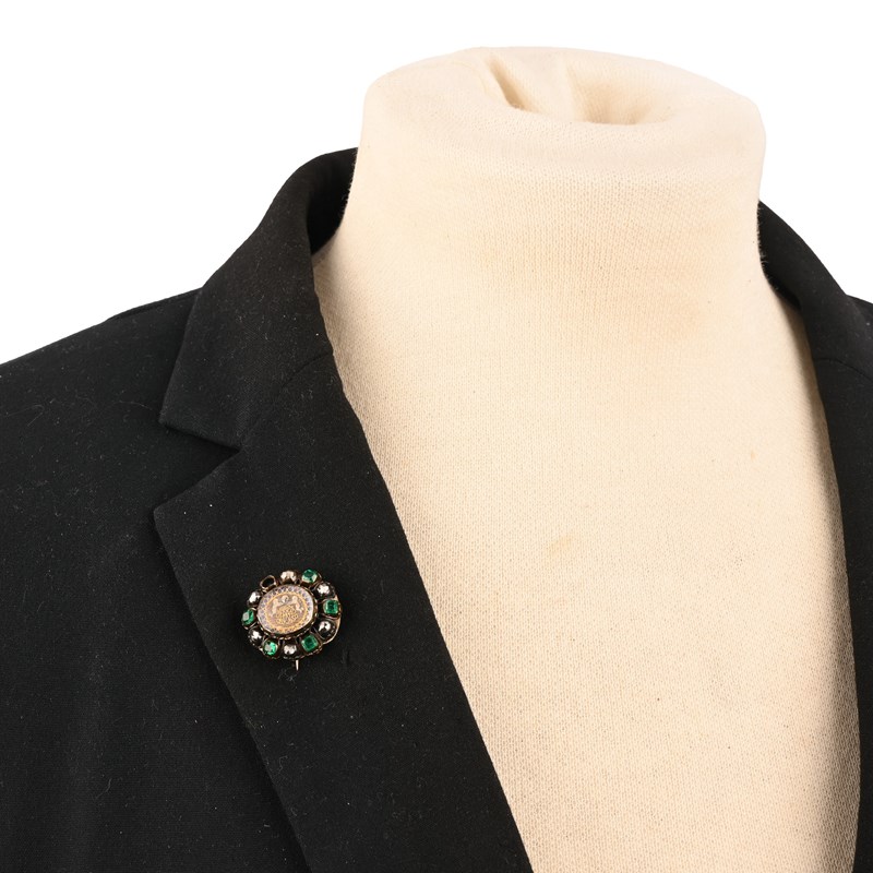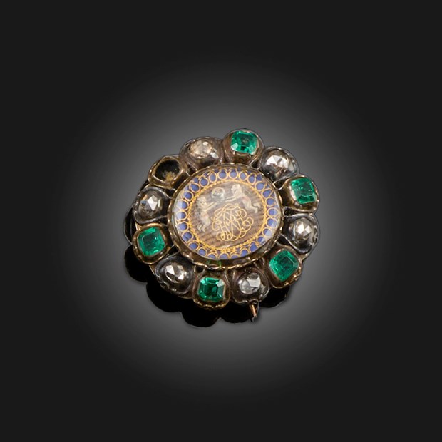 A 17TH CENTURY STUART CRYSTAL, EMERALD AND DIAMOND SLIDE, the stuart crystal set above a woven gold cypher and two putti holding a skull over woven hair, within a border of emeralds and diamonds in closed back silver and gold setting, later brooch fitting adapted from a slide, engraving for Frances Hackett to reverse, length 2.2cm