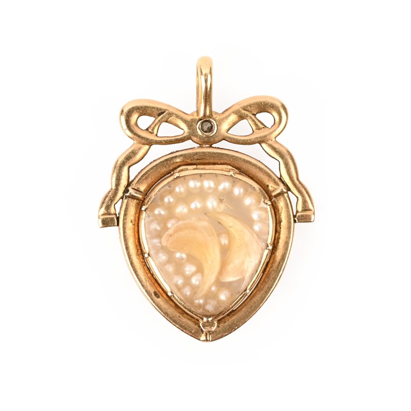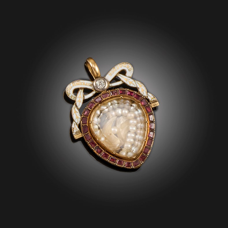 A LATE 18TH CENTURY RUBY AND DIAMOND SENTIMENTAL PENDANT, the drop-shaped faceted glazed compartment containing strands of seed pearls and two pearlescent claws, within a border of rubies below a ribbon-tie motif in white enamel inscribed 'Je vous aimerais toujours' translating to I will always love you, centred with an old cushion-shaped diamond, the reverse with a hinged glazed backing, mounted in gold, length 3.6cm
