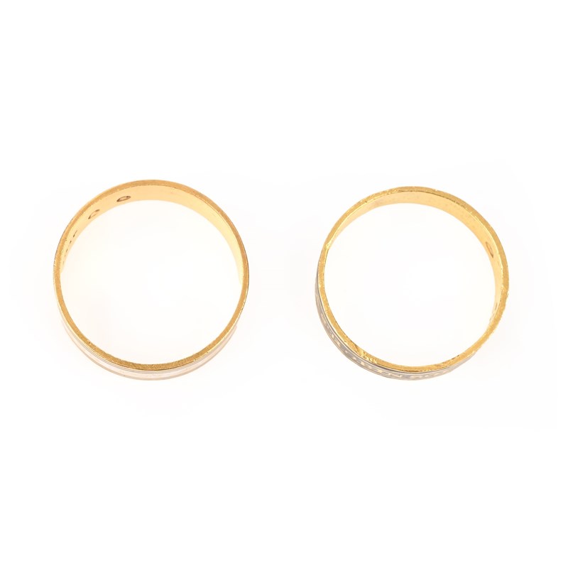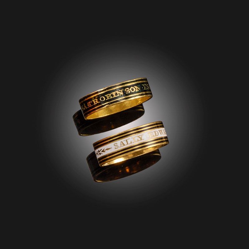 TWO GEORGE III MOURNING RINGS, comprising: a mourning ring with a central black enamel band inscribed in reserve 'Chas Robinson Esq Ob 24 Oct 1794 Æ 66' between plain black enamel bands, maker's mark IHIP, British hallmarks, size Q 1/2; and a mourning ring with a central white enamel band inscribed in reserve 'Sally Edwards Ob 3 Aug 1797 Æ 22', maker's marks IHIP, British hallmarks, size R