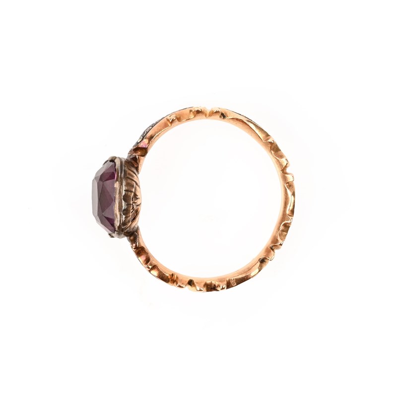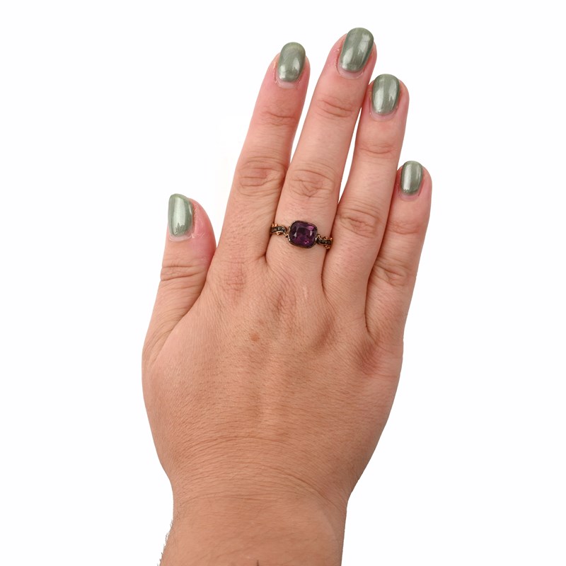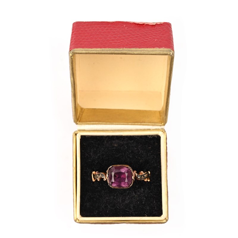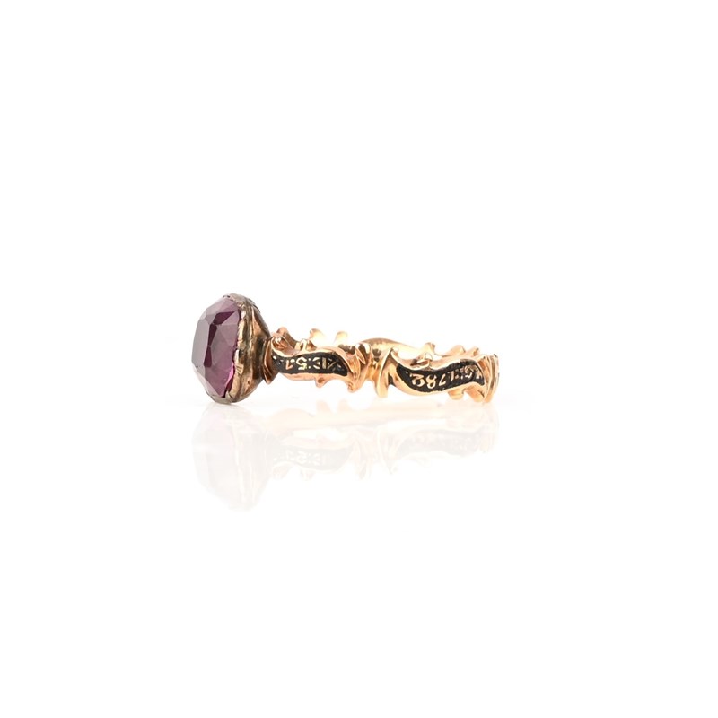 A GEORGE III AMETHYST MOURNING RING, set with a cushion-shaped amethyst, to a scrolling shank decorated with black enamel and inscribed in reserve 'James Jackson Ob May 15 1782 Æ 51', in gold, size M