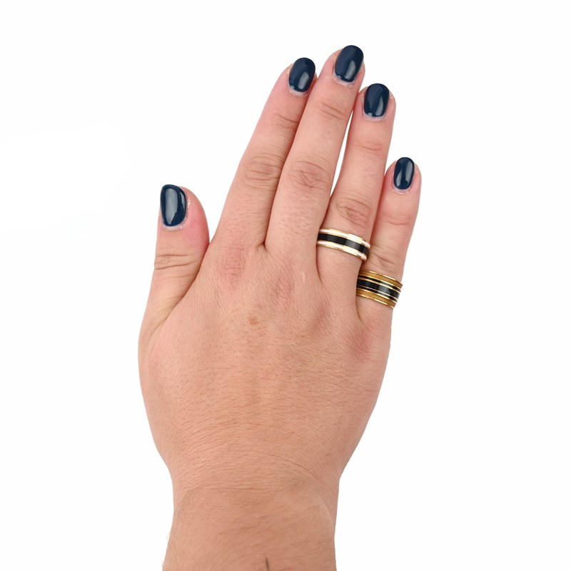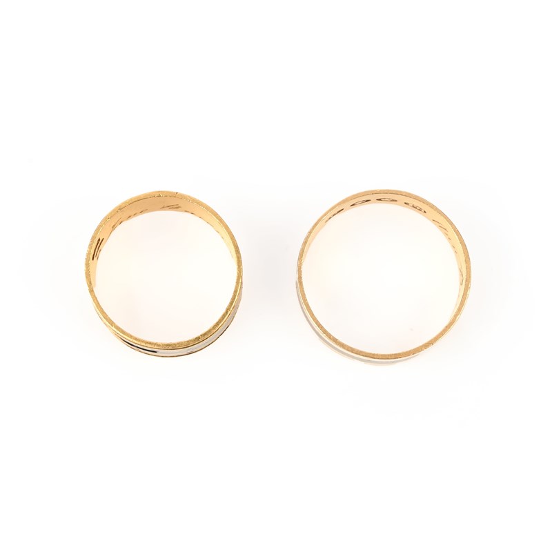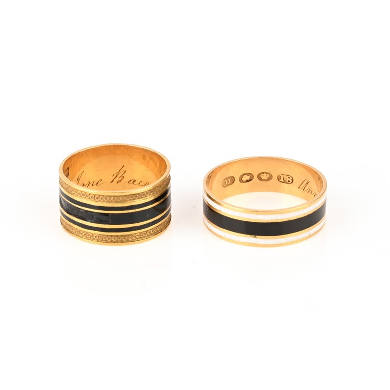 TWO GEORGE III MOURNING RINGS, comprising: a mourning ring with a black enamel band between two white enamel bands, inscribed to interior 'Ann Burdus obt 3 Apr 1807 Aet 80', maker's mark DL, British hallmarks, size Q 1/2, enamel chipped; and a mourning ring with three blank black enamel bands, inscribed to the interior 'Jane Bacon obt 1 Oct 1811 Aet 78', maker's mark DL, British hallmarks, size K 1/2, enamel chipped