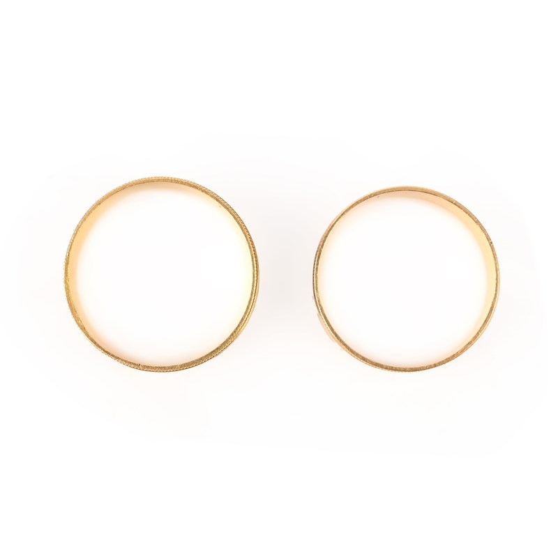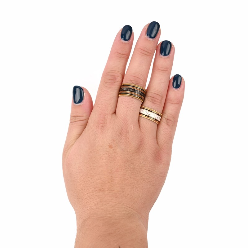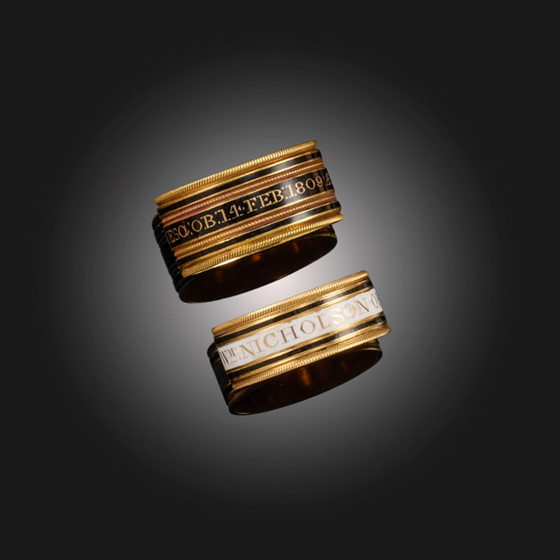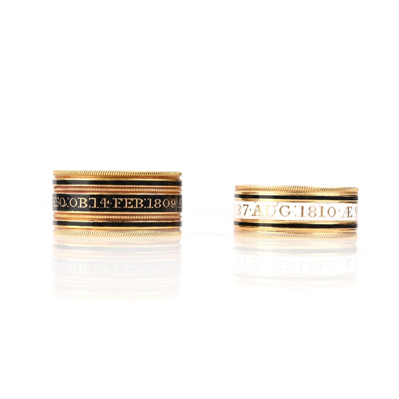 TWO GEORGE III MOURNING RINGS, comprising: a mourning ring with a central black enamel band inscribed in reserve 'Wm Holden Esq Ob 14 Feb 1809 Æ' between beaded borders and plain black enamel bands within ropetwist edges, maker's mark RCJB, British hallmarks, size approx. T 1/2; and a mourning ring with a central white enamel band inscribed in reserve 'Mw Nicholson Ob 27 Aug 1810 Æ 29' between plain black enamel bands within ropetwist edges, maker's mark RCJB, British hallmarks, size R 1/2