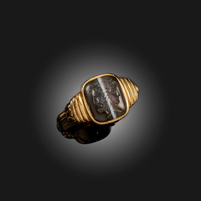 A BANDED AGATE INTAGLIO RING, LATE 18TH - EARLY 19TH CENTURY, the rectangular intaglio carved with Janus in profile, with clever use of the natural white band dividing the two faces, later gold ring, size P
