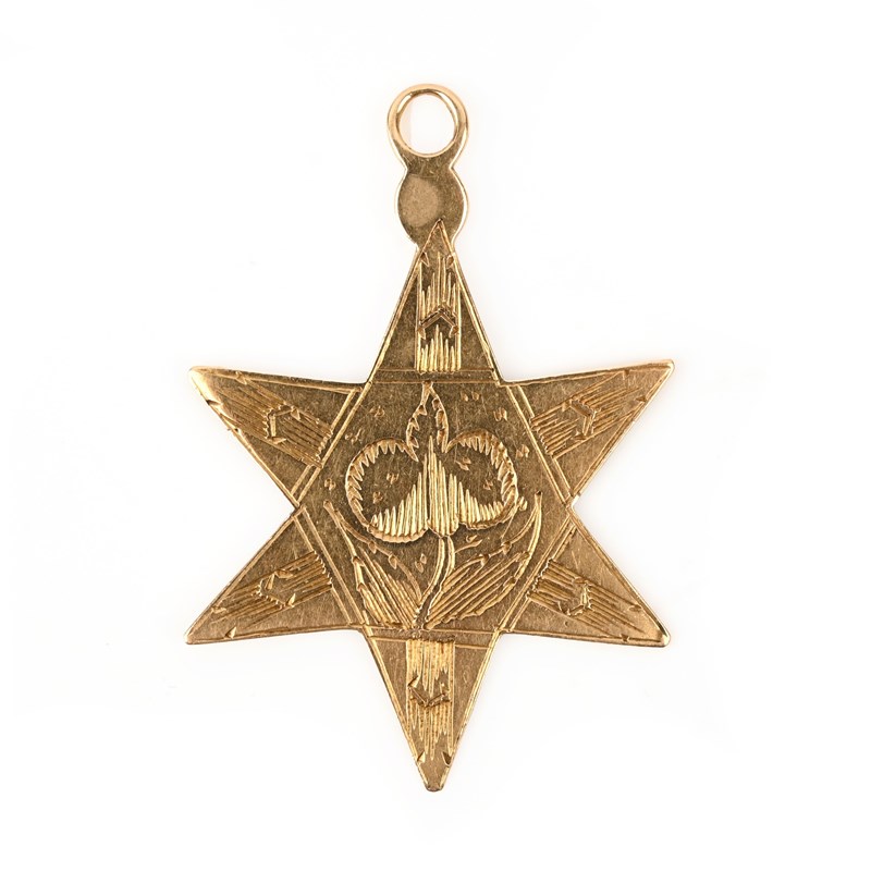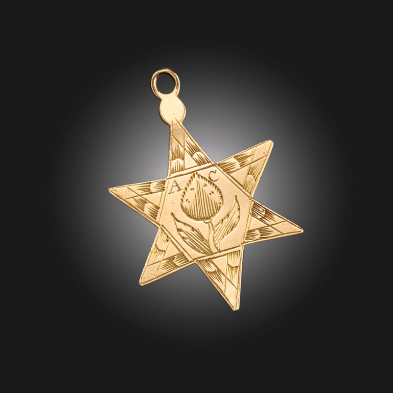 A GOLD PENDANT, designed as a six-pointed star, both sides with engraved borders around a central floral motif, one side with initials 'AC', length 4.2cm, 4g