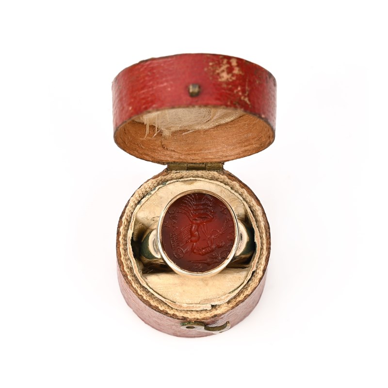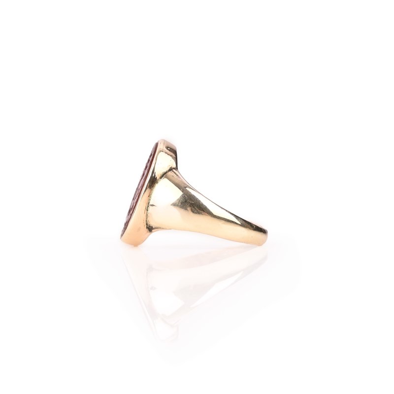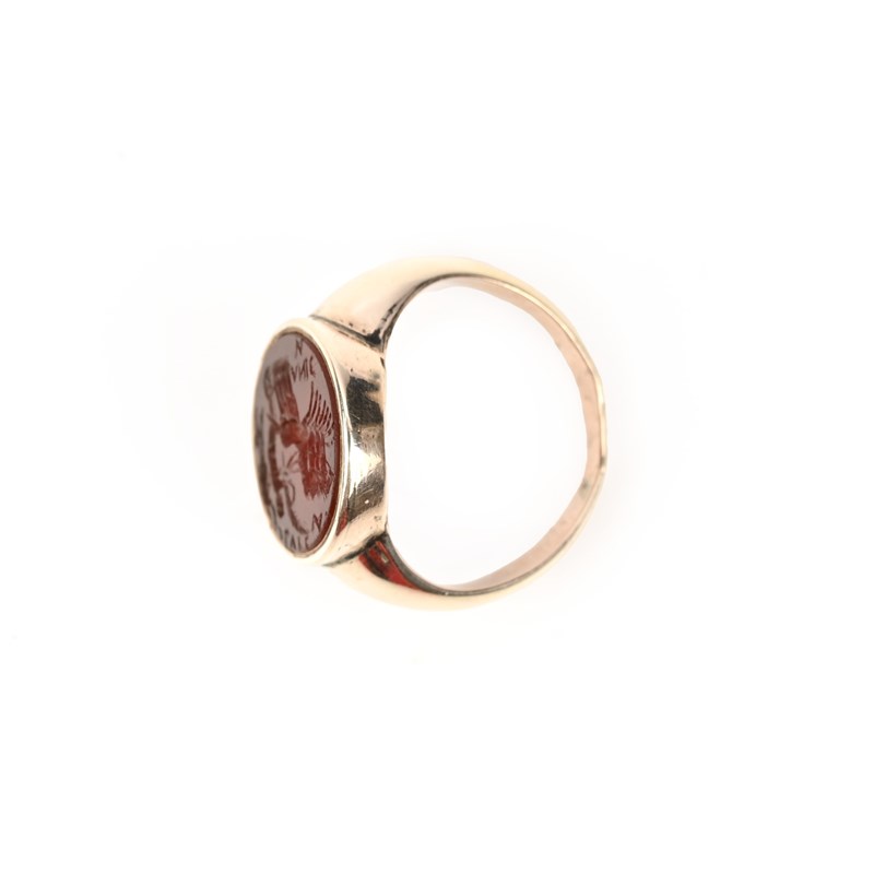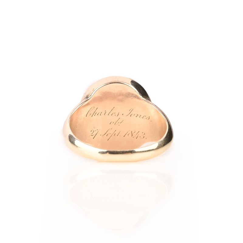 A ROMAN CARNELIAN INTAGLIO, 1ST CENTURY AD, depicting a quadriga with horses, the winning driver with palm branch and the standing figure of Victoria behind about to crown him with a laurel wreath, in a later closed-back low carat gold mount engraved 'Charles Jones obt 27 Sept 1843', intaglio 15.18 x 13.31mm, shank size M, early 19th century case