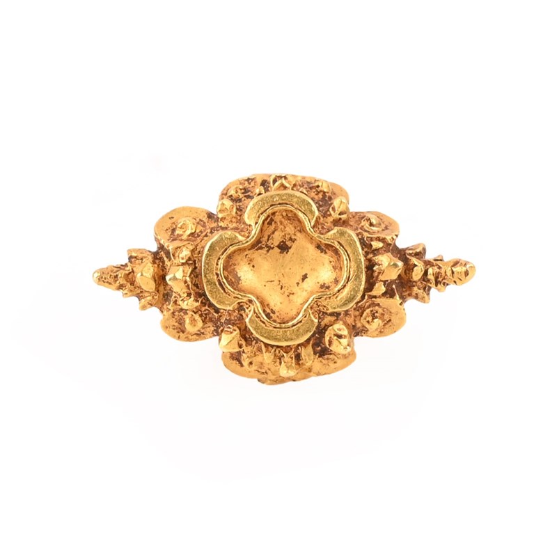 A GOLD EAR ORNAMENT, JAVA, 8TH-12TH CENTURY, with a central vacant quatrefoil within scrolling foliate decoration, length 2.5cm, weight 13.5g