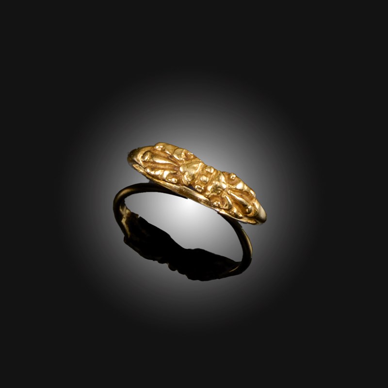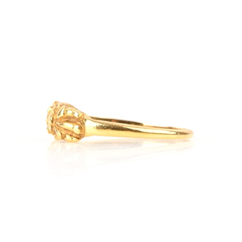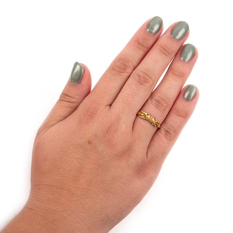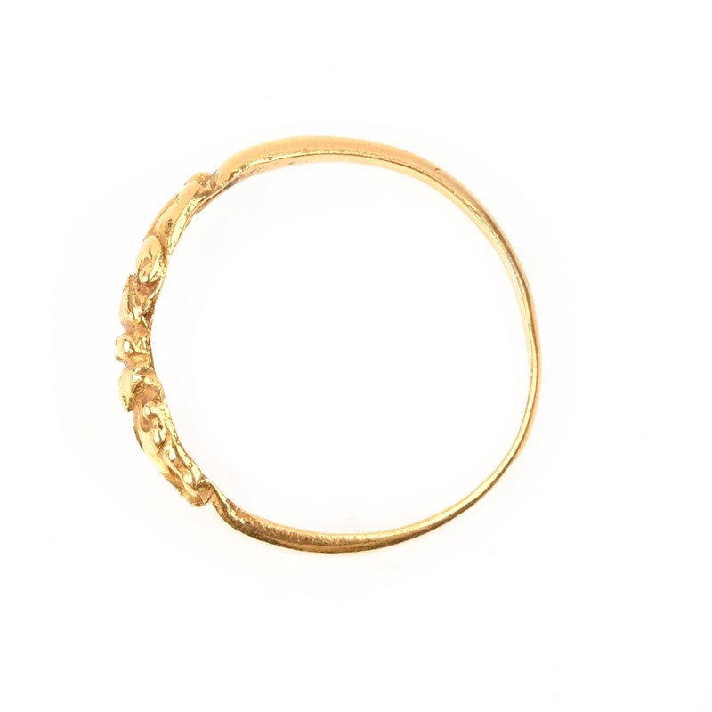 A GOLD RING, JAVA, centred with a decoration of carved foliate scrolls, size O 1/2, weight 2.1g