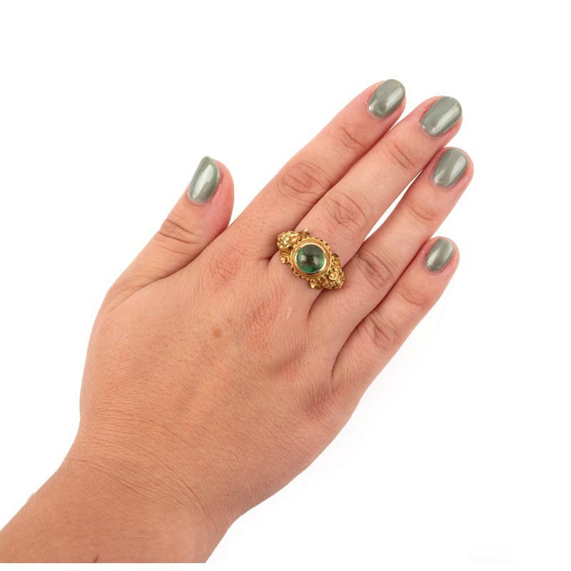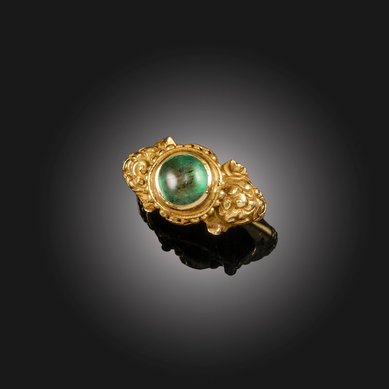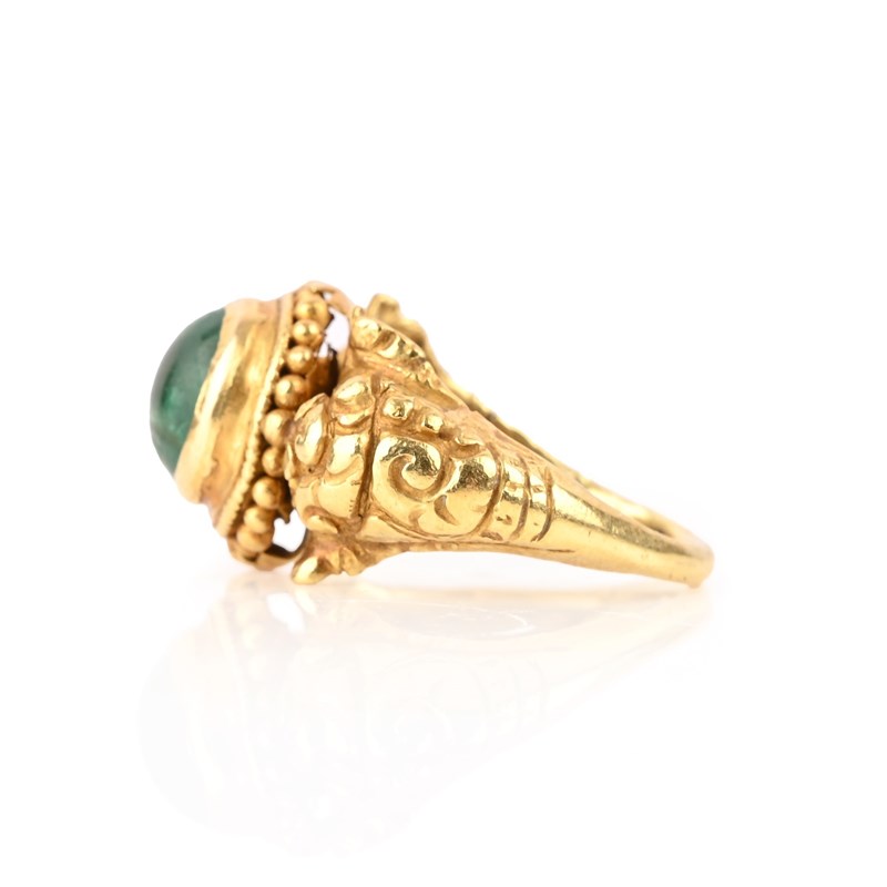 A GOLD AND EMERALD RING, JAVA, 8TH-12TH CENTURY, the central emerald cabochon collet-set within engraved foliate shoulders, size N