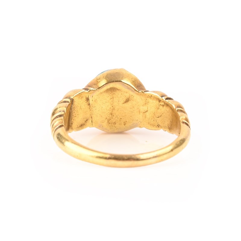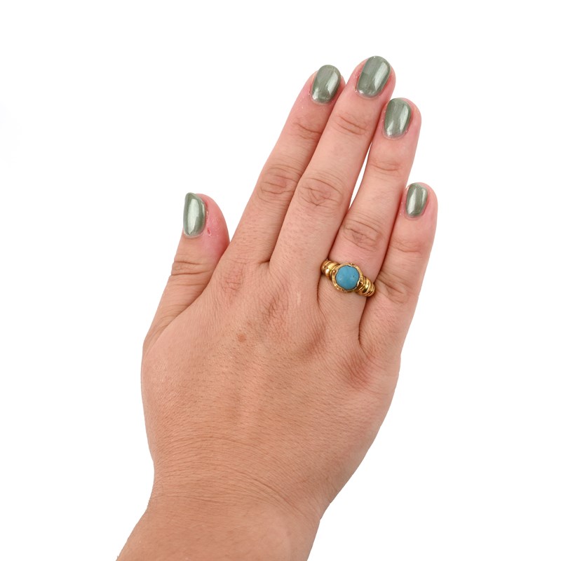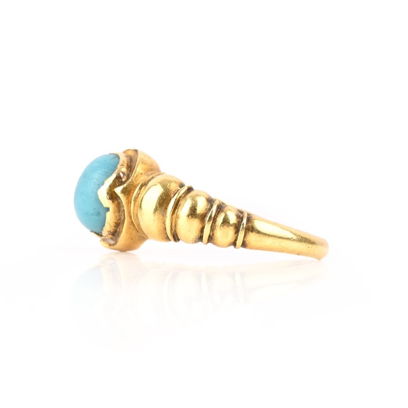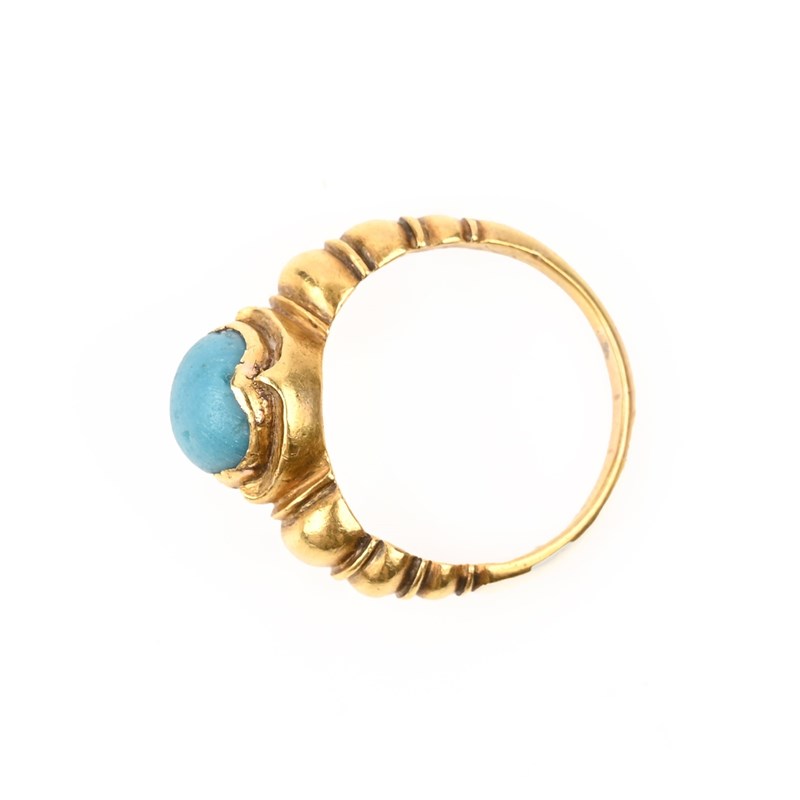A TURQUOISE AND GOLD RING, JAVA, 8TH-12TH CENTURY, the cabochon turquoise set between ridged shoulders, size L 1/2
