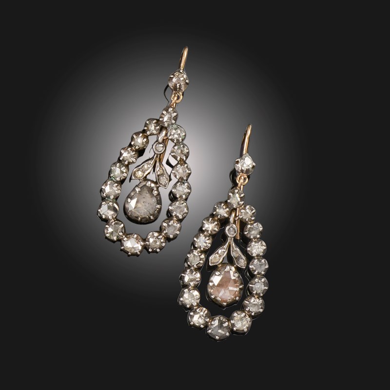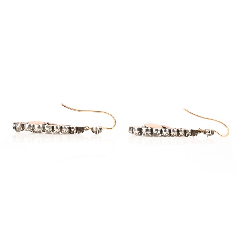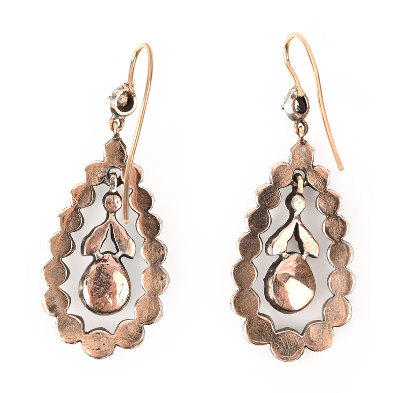 A PAIR OF DIAMOND DROP EARRINGS, each composed of central foliate pendant set with rose-cut diamonds within a surround set with further graduated rose-cut diamonds, mounted in silver and gold closed-back settings, later shepherd's hook fittings, length 4.4cm