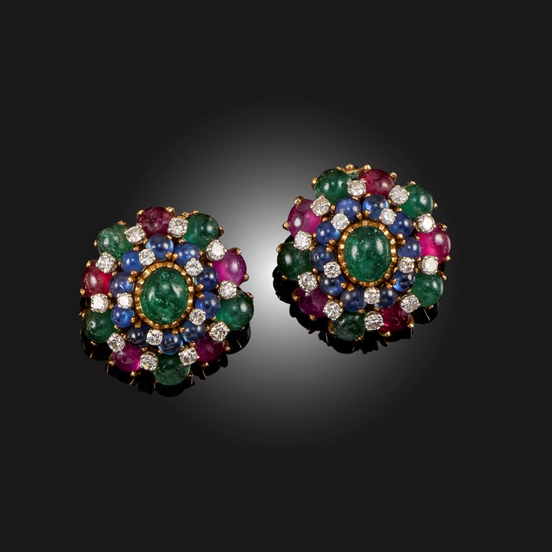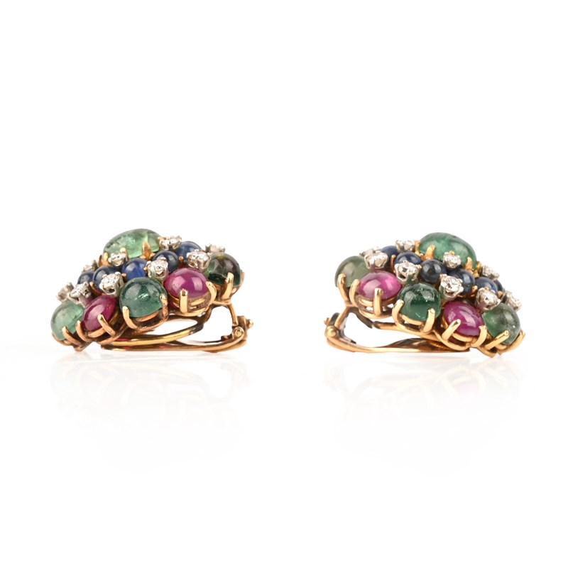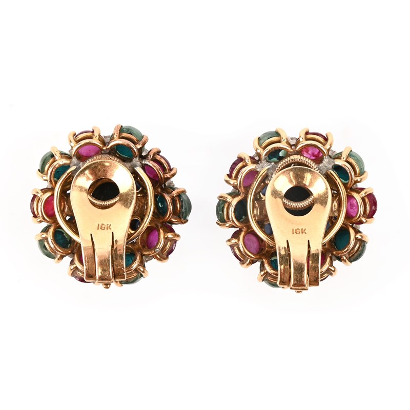 A PAIR OF GEM-SET GOLD EARCLIPS, each of cluster design, set with emerald, sapphire and ruby cabochons and accented with round brilliant-cut diamonds, stamped 18K, clip fittings, width 2.5cm, gross weight 23g