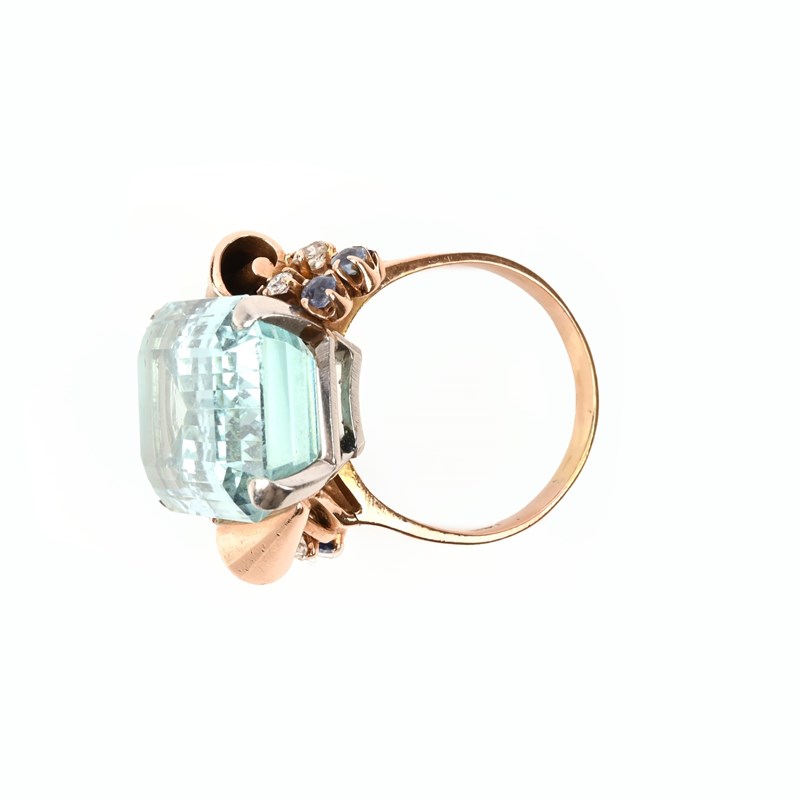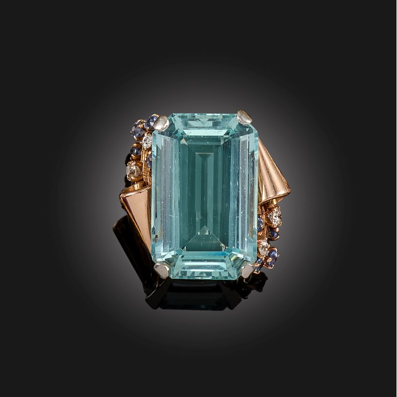 AN AQUAMARINE, SAPPHIRE AND DIAMOND DRESS RING