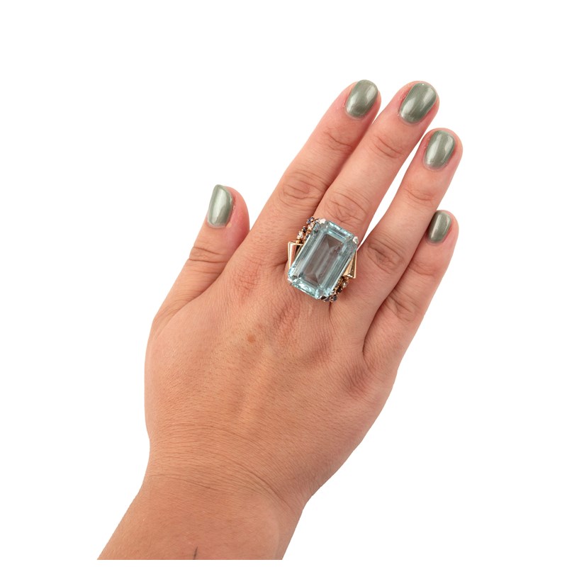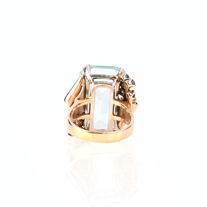 AN AQUAMARINE, SAPPHIRE AND DIAMOND DRESS RING, set with an emerald-cut aquamarine weighing approximately 27.00cts claw set in platinum, to a gold shank with scrolling shoulders accented with sapphires and diamonds, stamped 14k, size U 1/2