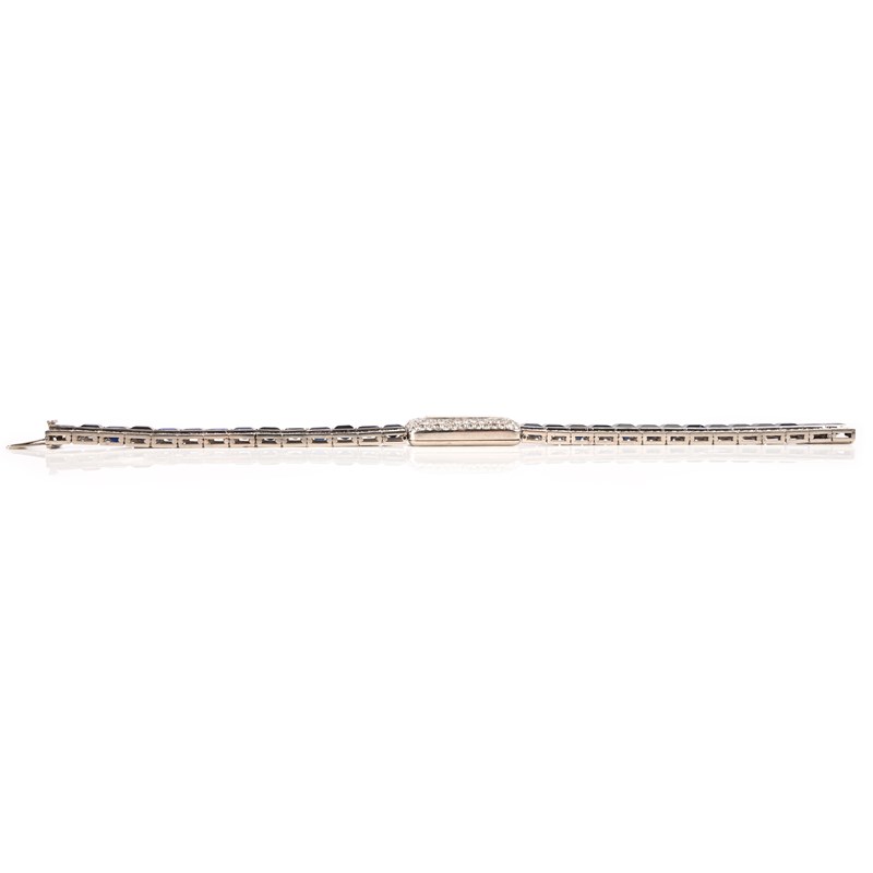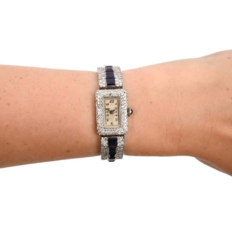 GARRARD, AN ART DECO SAPPHIRE AND DIAMOND COCKTAIL WATCH, the rectangular dial with black Arabic numerals and blued hands, to a bezel pavé-set with round brilliant-cut diamonds, the integral strap channel-set with carré-cut sapphires within borders pavé-set with round brilliant-cut diamonds in platinum, manual movement, case signed Garrard, case width 1.5cm, strap length 17cm