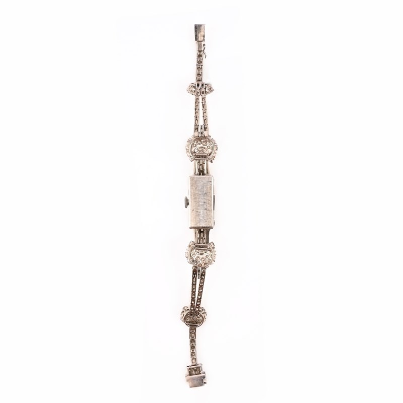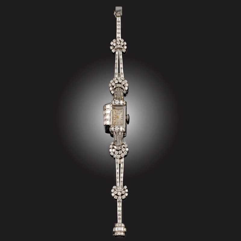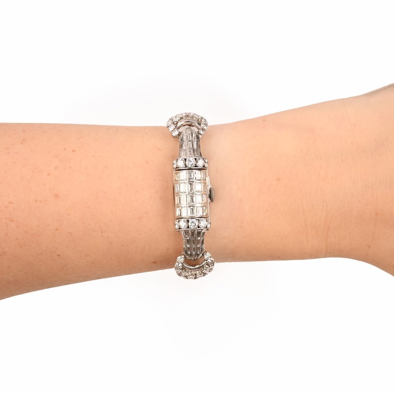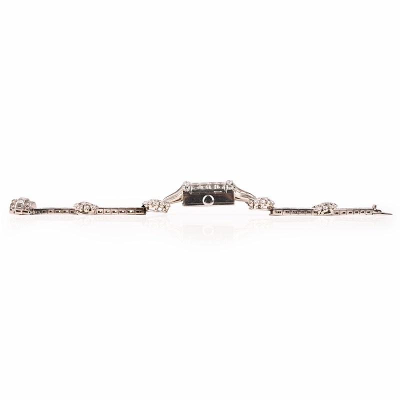 A LADY'S DIAMOND COCKTAIL WATCH, the bracelet set with carré- and baguette-shaped diamonds and accented with clusters of round brilliant-cut diamonds, centring on a watch case with a hinged cover of channel-set baguette diamonds, to a diamond-set bezel and shoulders, in platinum, with a later added Cartier dial and movement, case width 1cm, bracelet length 6.4cm