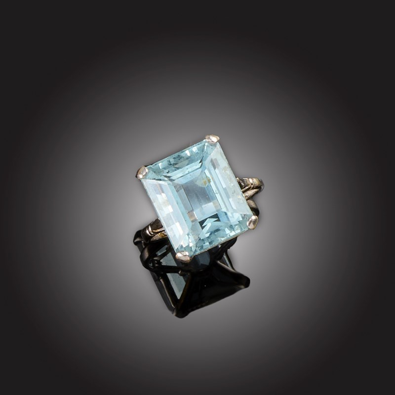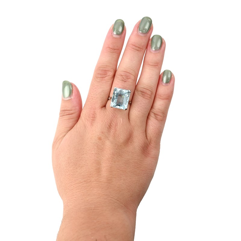 AN AQUAMARINE SOLITAIRE RING, set with an emerald-cut aquamarine weighing approximately 12.72cts claw-set in platinum, stamped Plat, size M, sizing beads