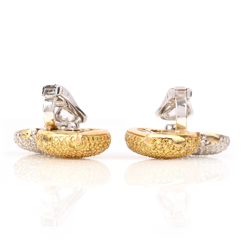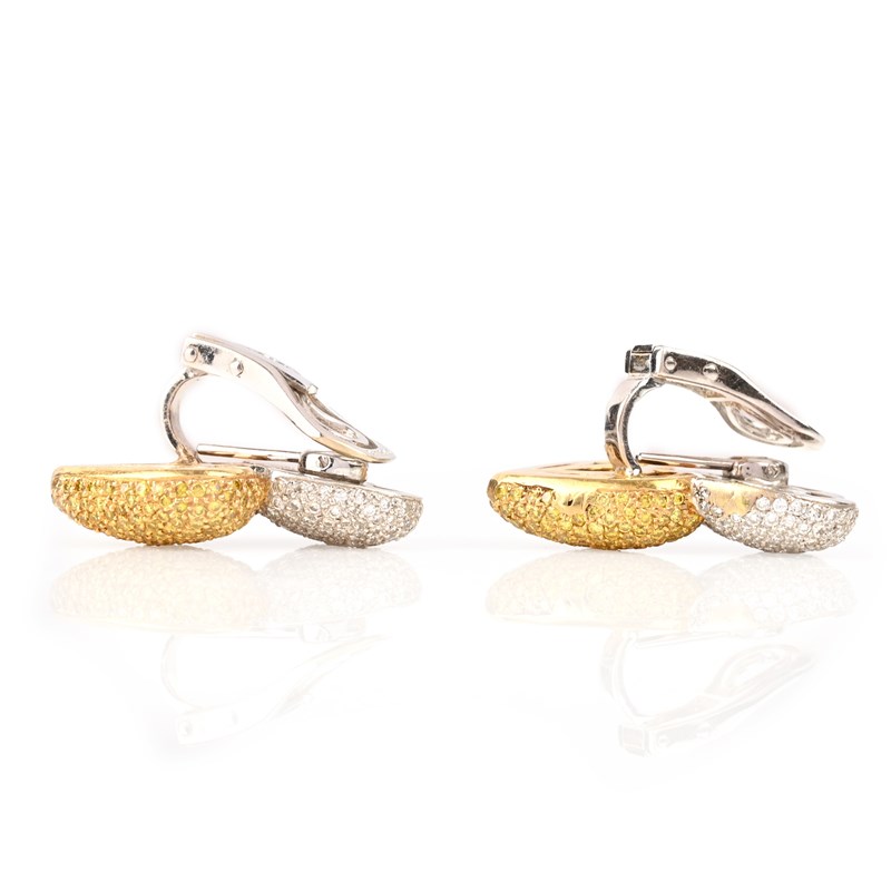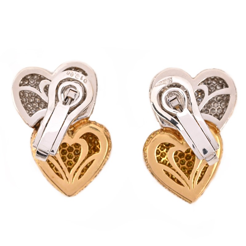 DIANOOR, A PAIR OF FANCY YELLOW AND WHITE DIAMOND EARRINGS, designed as two interlocking hearts, each pavé-set with fancy yellow and colourless diamonds respectively, signed Dianoor, stamped 750 and D12.86, length 2.8cm, folding post and clip fittings