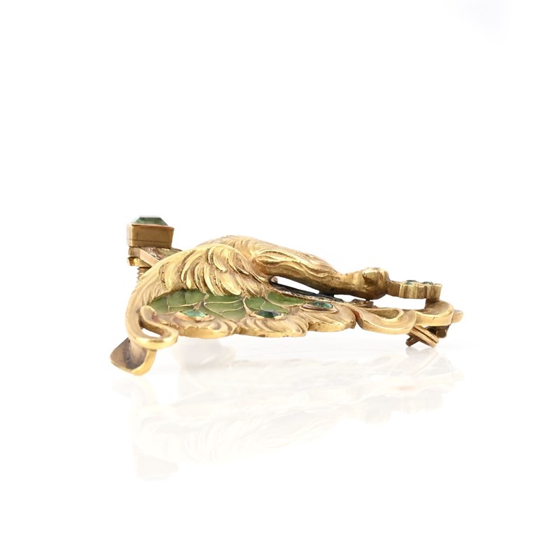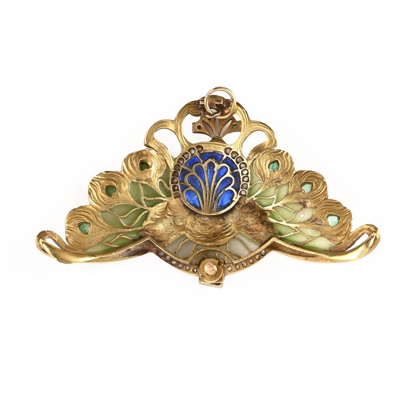 AN ART NOUVEAU EMERALD, DIAMOND AND ENAMEL PENDANT, designed as a peacock, the plumage detailed with textured yellow gold and emeralds and decorated with plique-à-jour enamel and rose-cut diamonds, above a further arc of plique-à-jour enamel with emerald and diamond border in yellow gold, with Austrian import marks, fitting for conversion to brooch, width 6.9cm, gross weight 21g, chip to enamel and one emerald