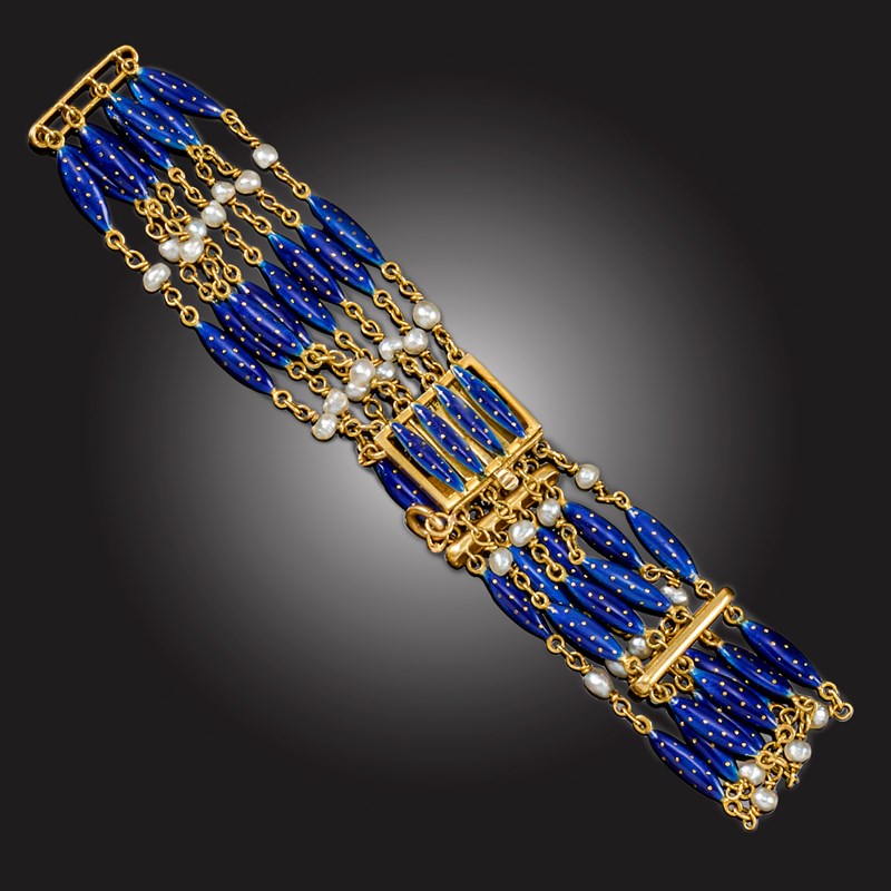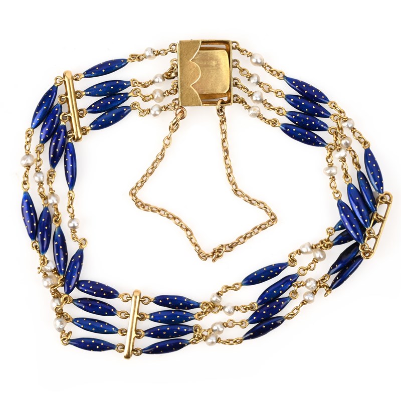 THEODOR FAHRNER, A JUGENDSTIL SEED PEARL AND ENAMEL BRACELET, composed of four rows of blue enamelled links alternating with seed pearls and spacer links, in yellow gold, maker's monogram, stamped 750, length 17.5cm, gross weight 11g
