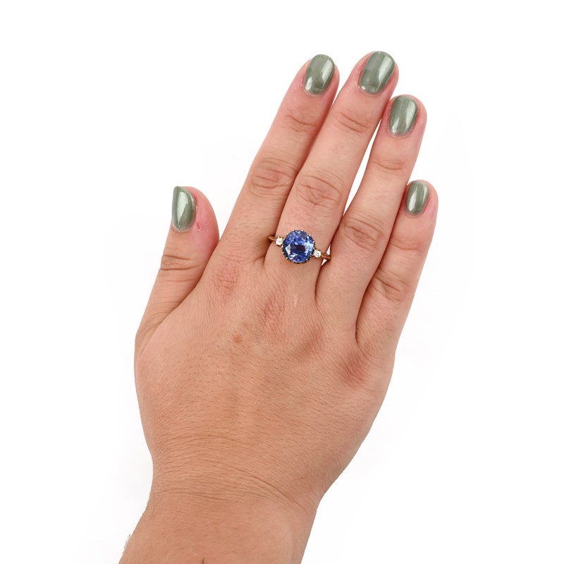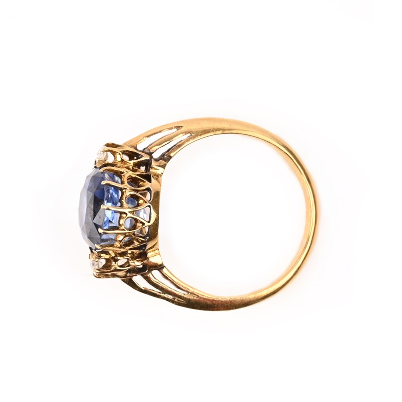A SAPPHIRE SOLITAIRE RING, the old cushion-cut sapphire weighing approximately 5.50cts, within diamond-set shoulders, in yellow gold, size R 1/2