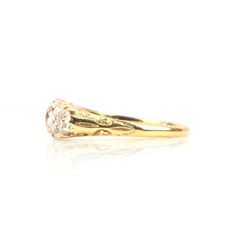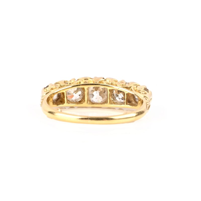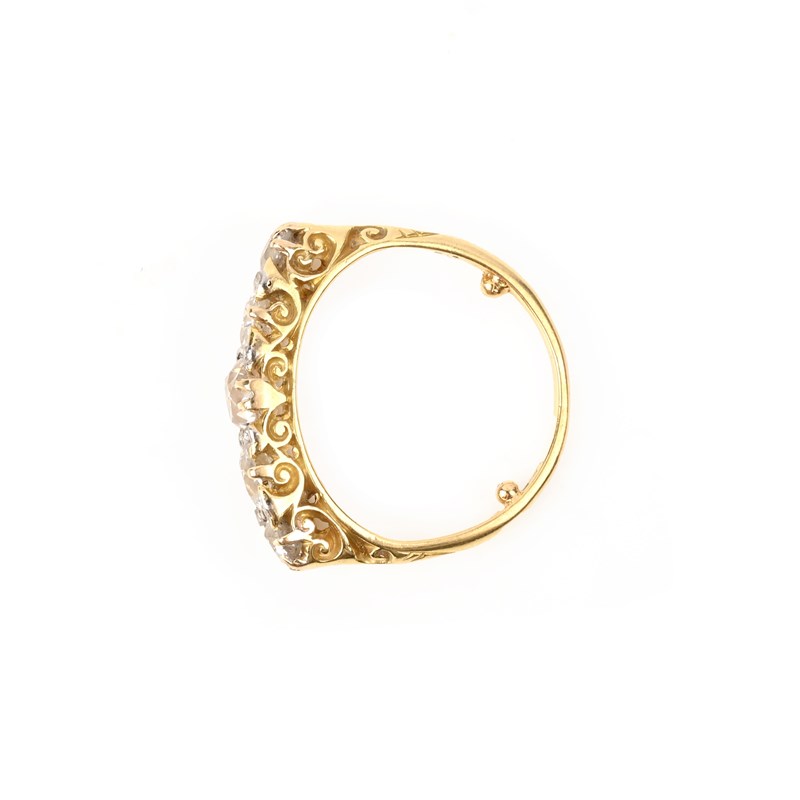 A DIAMOND FIVE-STONE RING, set with graduated old-cut diamonds, to a pierced scrolling mount in yellow gold accented with rose-cut diamonds, stamped 18, size M approx, sizing beads