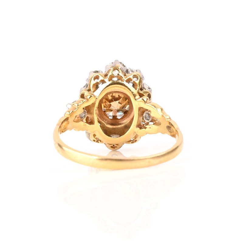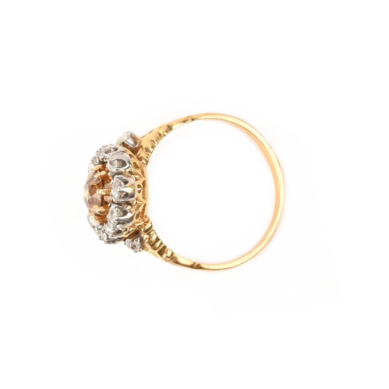 A FRENCH BROWN AND WHITE DIAMOND CLUSTER RING, centring on a round brilliant-cut brown diamond in an illusion setting, within a border of graduated old circular-cut diamonds, to bifurcated diamond-set shoulders in platinum and yellow gold, French control marks, size T