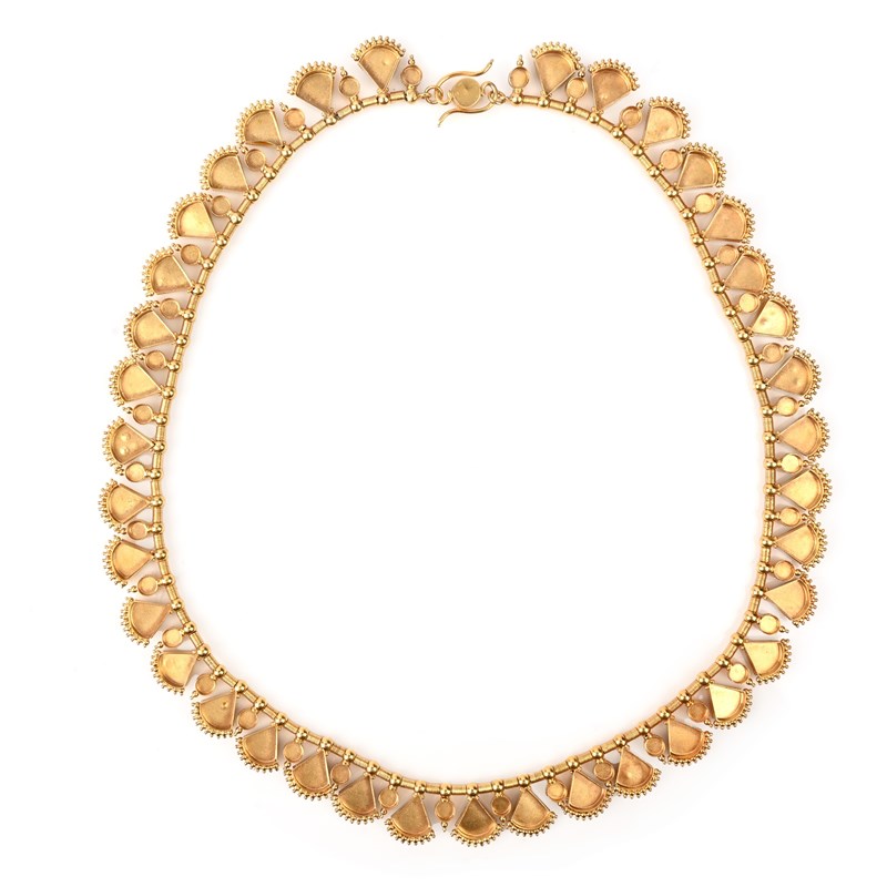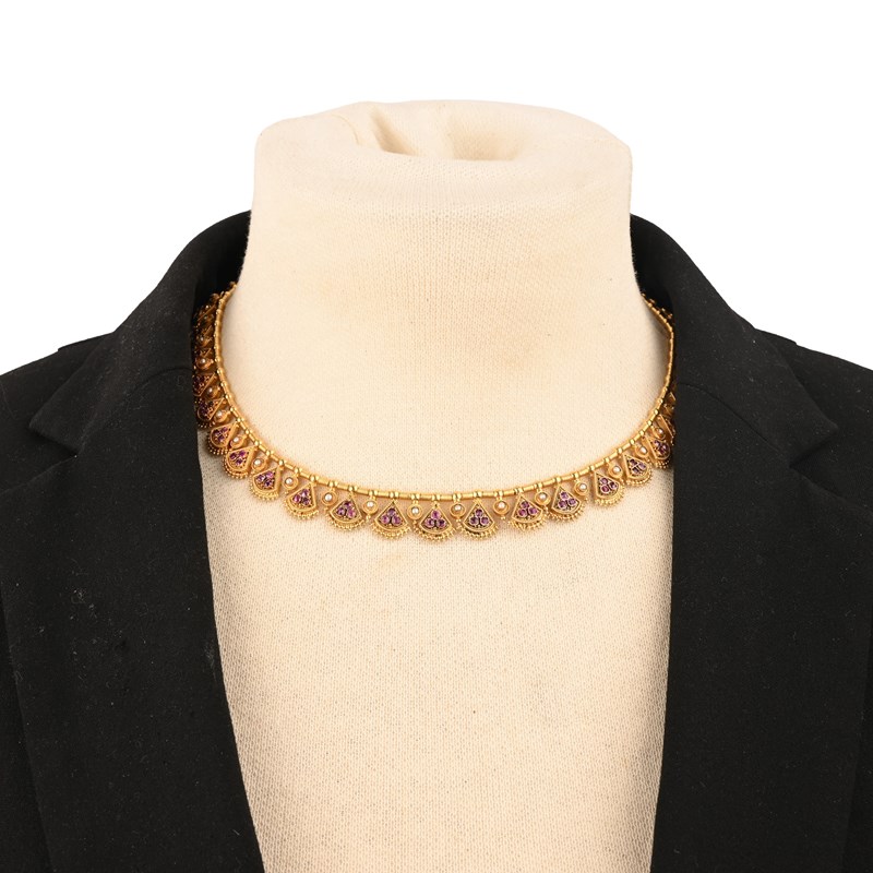 AN ETRUSCAN REVIVIAL STYLE SEED-PEARL AND RUBY SET FRINGE NECKLACE