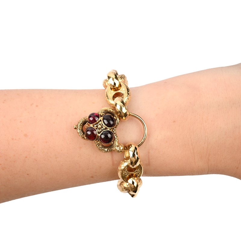 A VICTORIAN GARNET-SET BRACELET, MID-19TH CENTURY, of foliate engraved anchor-links alternately-set with textured circular links, with a garnet cabochon-set trefoil form clasp, in yellow gold, bracelet inner circumference 16.5cm, clasp length 3.5cm
