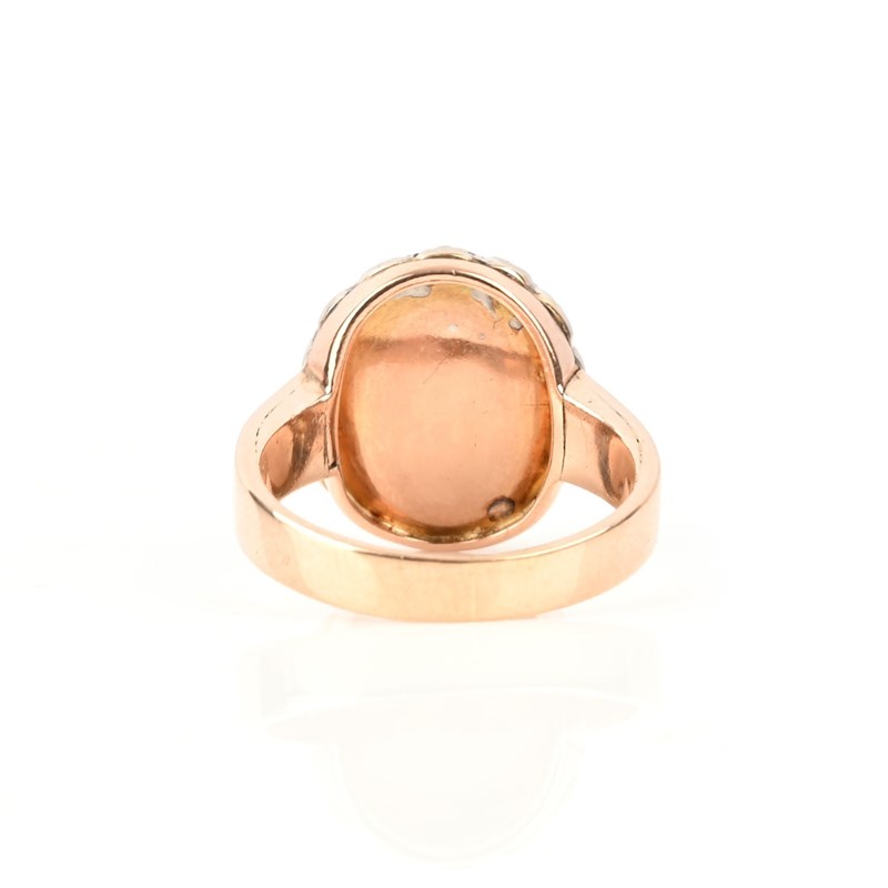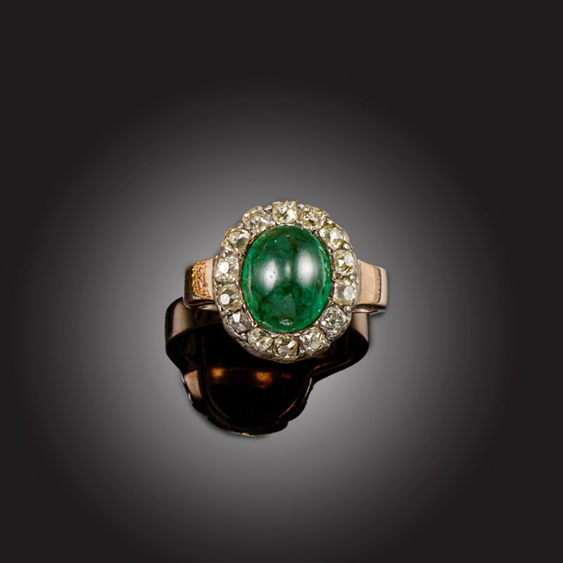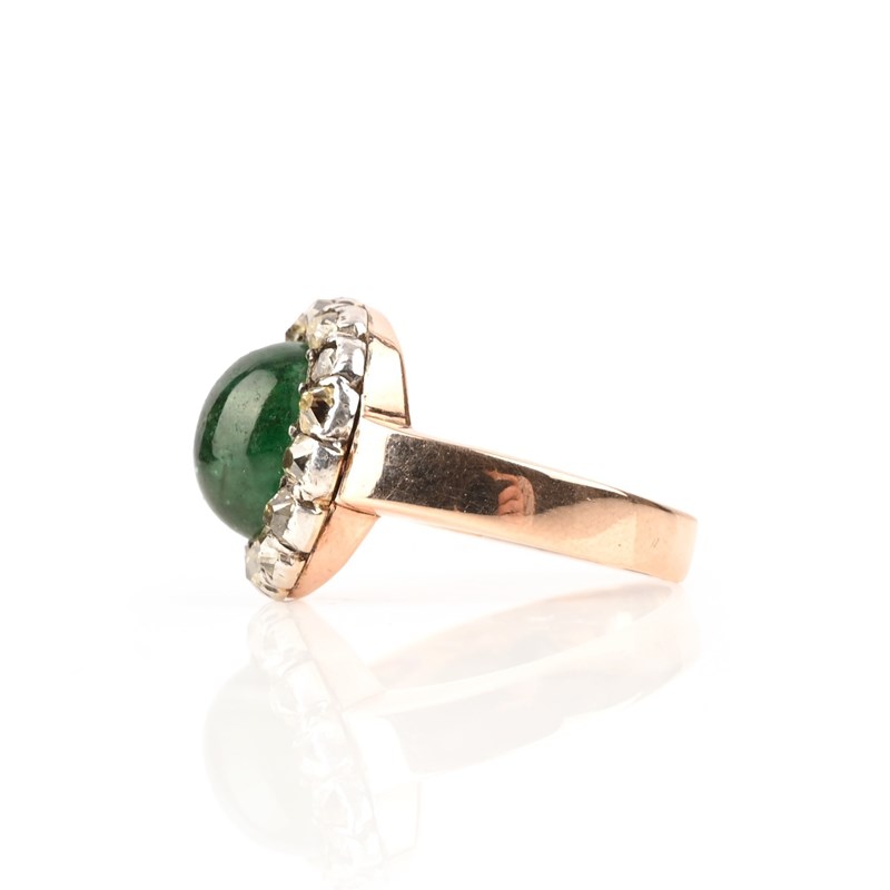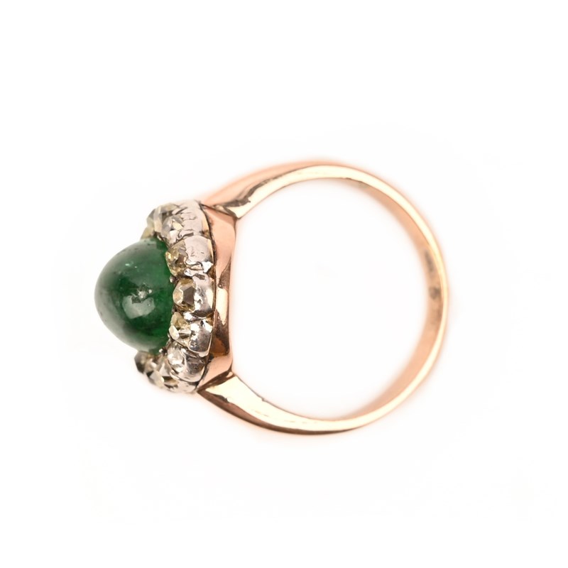 A EMERALD AND DIAMOND CLUSTER RING, set with a cabochon emerald, within a border of old mine-cut diamonds, mounted in rose gold, size N 1/2