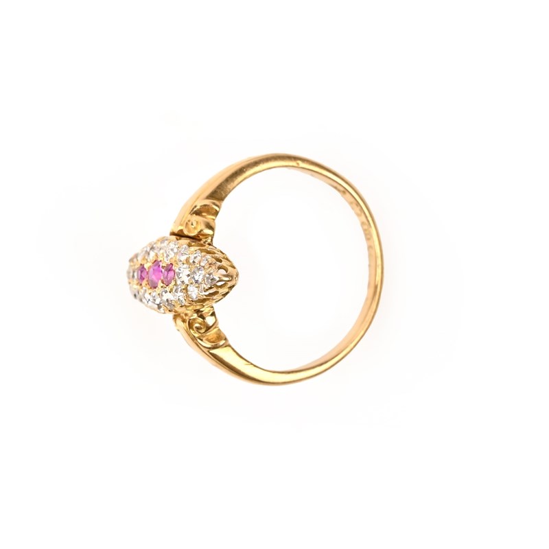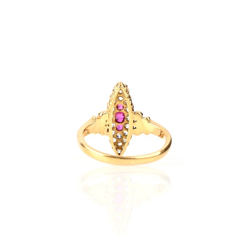 AN EARLY 20TH CENTURY RUBY AND DIAMOND RING, of lozenge design, set with three graduated old oval-shaped rubies within a surround of diamonds in 18ct yellow gold, Birmingham hallmarks, marks partially worn, size O