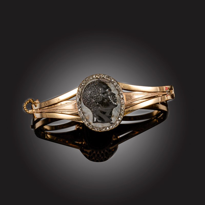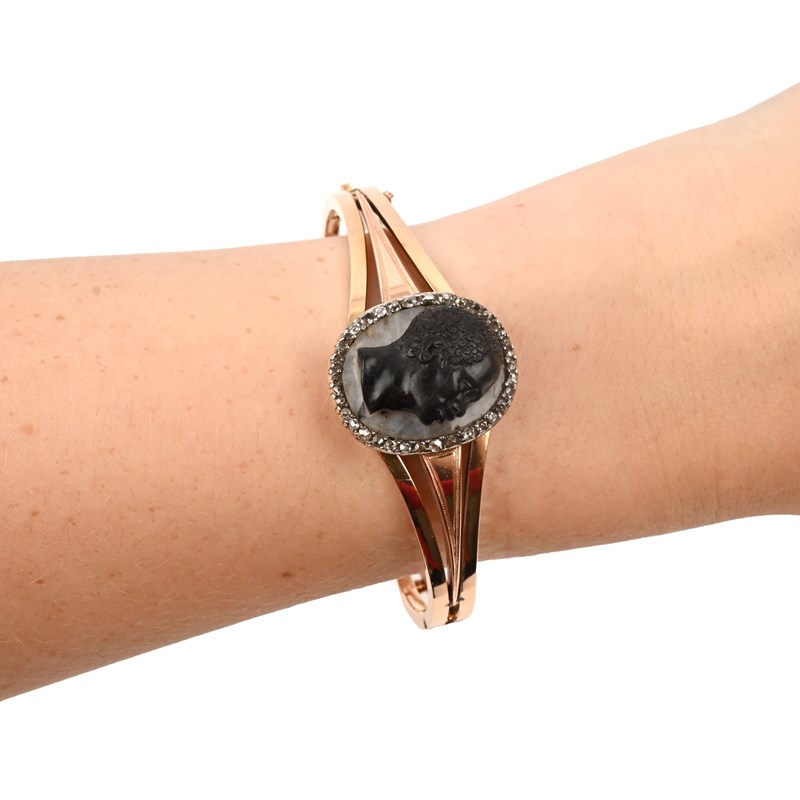 A VICTORIAN BANDED AGATE AND DIAMOND CAMEO BANGLE