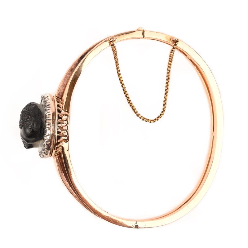 A VICTORIAN BANDED AGATE AND DIAMOND CAMEO BANGLE, of hinged design, set with a banded agate 'Blackamoor' cameo within a border of rose-cut diamonds, mounted in silver and gold, inner circumference 17.5cm, gross weight 25g