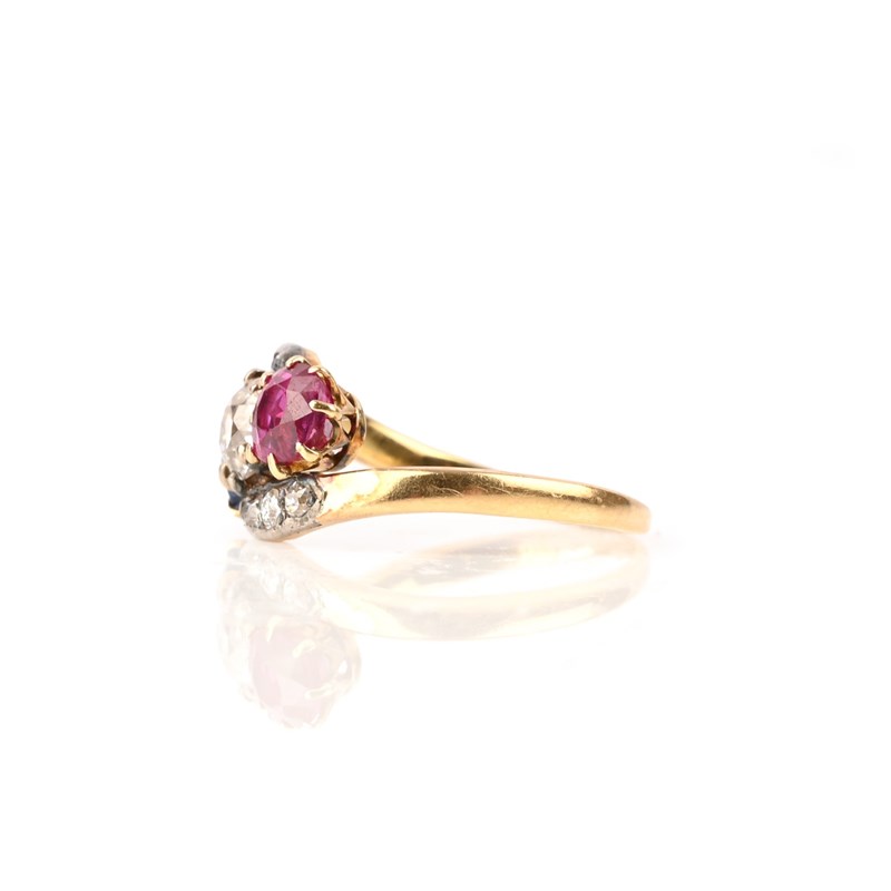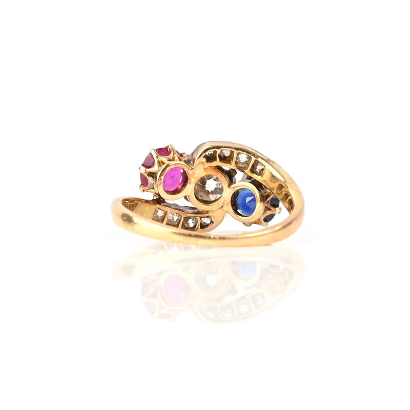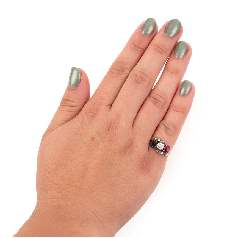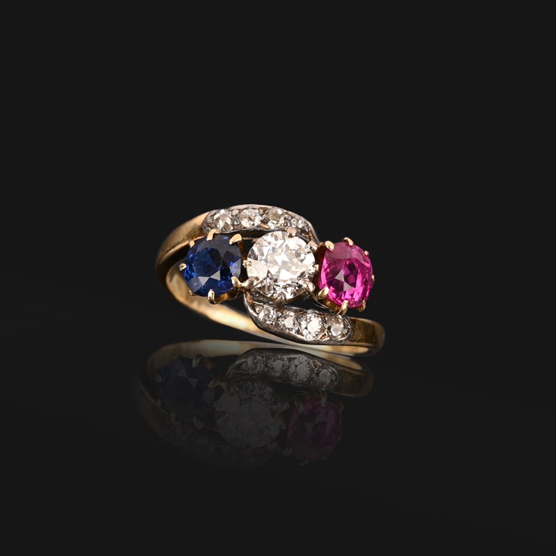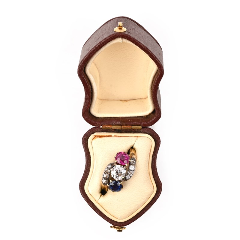 A LATE 19TH CENTURY RUBY, SAPPHIRE AND DIAMOND THREE-STONE RING, the central old circular-diamond between a circular-cut ruby and a circular-cut sapphire, to diamond-set shoulders of crossover design, in silver and gold, size K 1/2, case